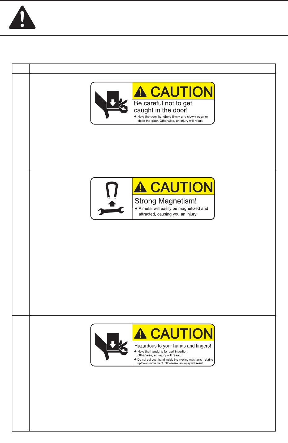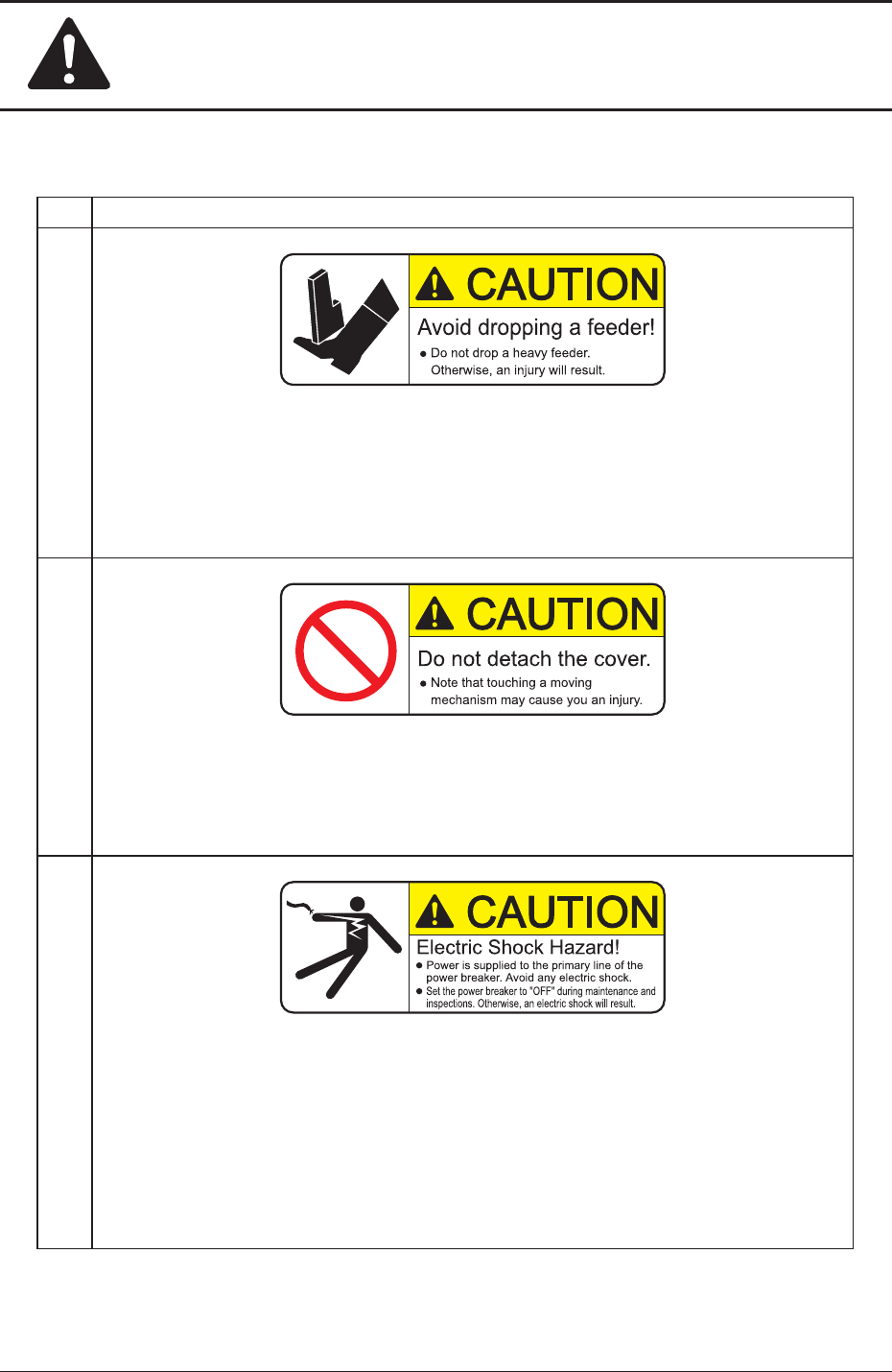 Safety Precautions Safe-28 AIVE-ID No. Alert Labels and Description (1 1) Description Do not drop a feeder . Ot herwise, a foot injury will result or the feeder itself may be damaged. Carefully handle each feeder one b…
