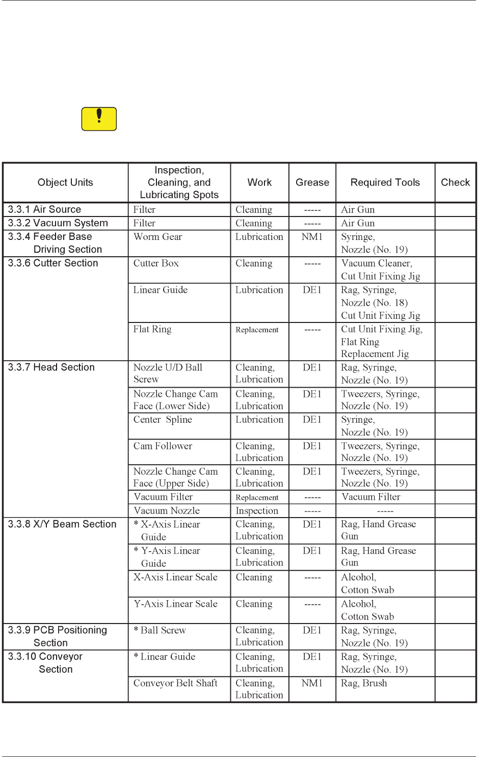 1-13 AIVEMT -ID 2.4 Quarterly Maintenance Grease Symbols DE1: DAPHNE EPONEX GREASE No. 1 NM1: MOL YNOC GREASE AP1 Notice Lubrication must be made on the *-marked items after initial month and every 3 months for the subse…