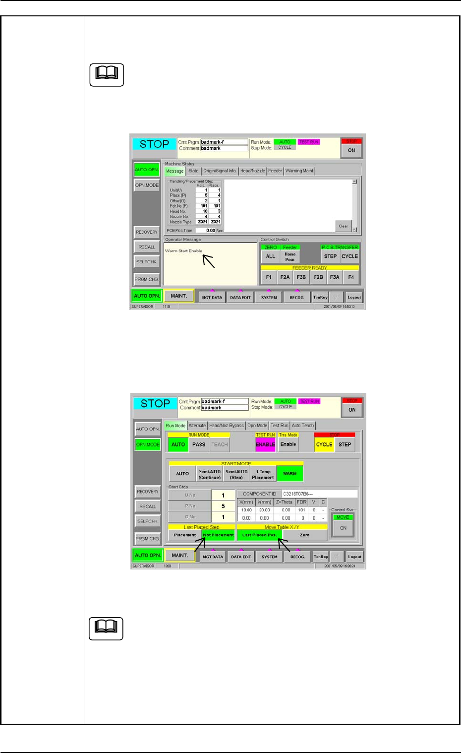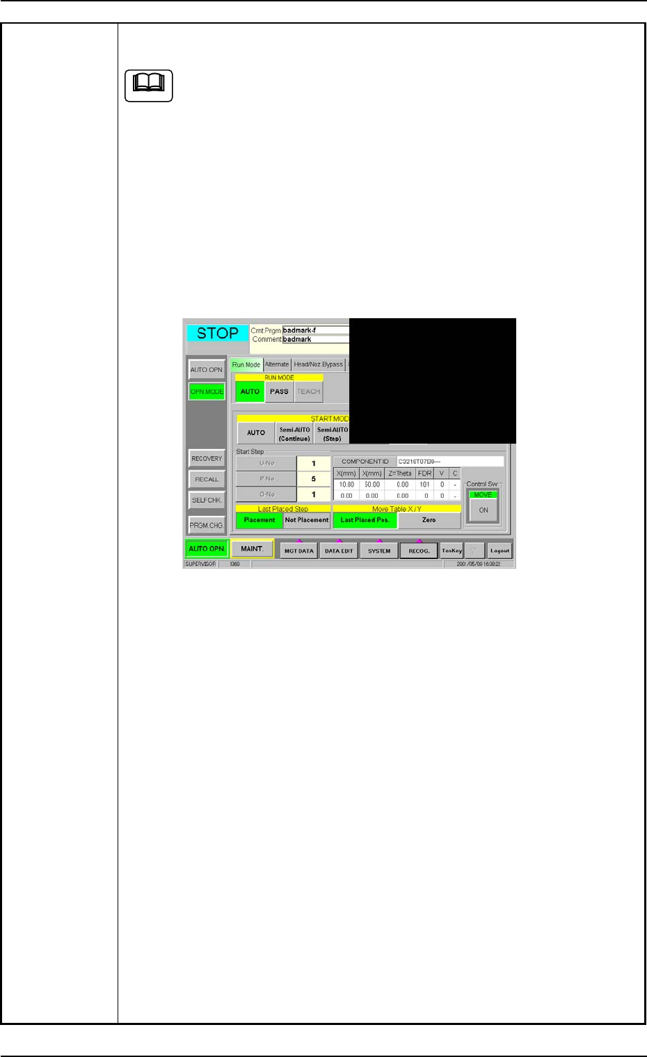 (10) Check how the last component was placed when the operation was in- terrupted. The last placement step is indicated in the "Start Step" group box in the "OPN. MODE" window (submenu). Check visuall…
