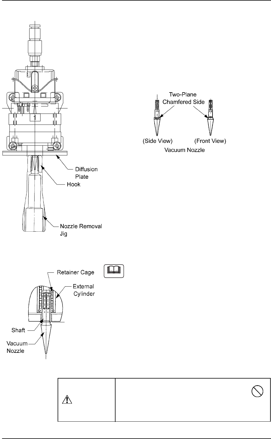 (1-6) Detachment of V acuum Nozzle Push the bottom of the nozzle removal jig gently and set it on the vacuum nozzle such that the hook is engaged correctly with the two-plane cham- fered side of the vacuum nozzle. Note: …