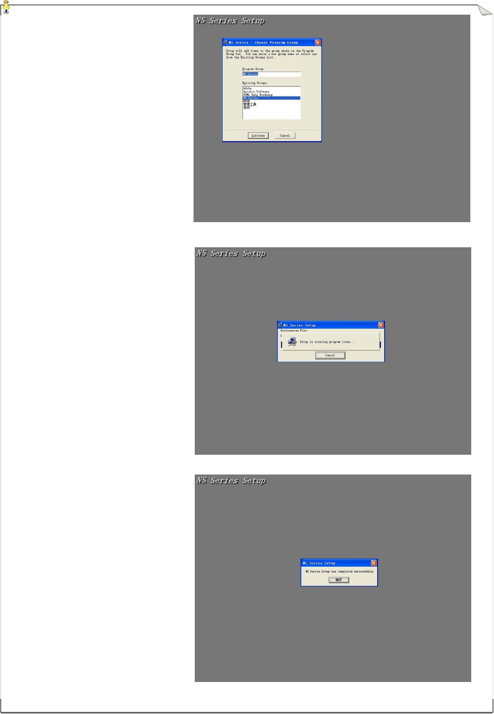 劲拓电子设备有限公司 第 10 页 共 66 页 NS 系列无铅回流焊机用户手册 (A1.0) 系统将显示如右图画面,要求用户 选择软件安装的程序组,系统默认的 是 “ NS Series ” ,按 “ Continue ” 将进行下一步安装,。 系统显示如右图系统复制文件进 度的安装接口。 拷贝完文件后将会更新系统,最后出 现如右图安装完毕的画面