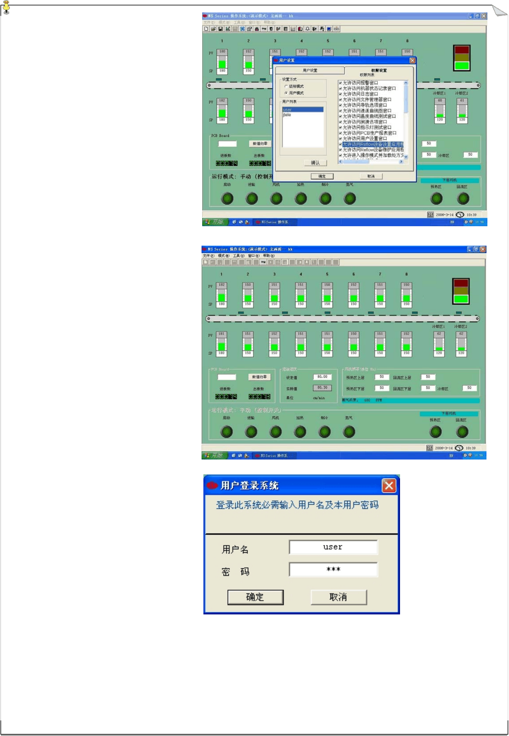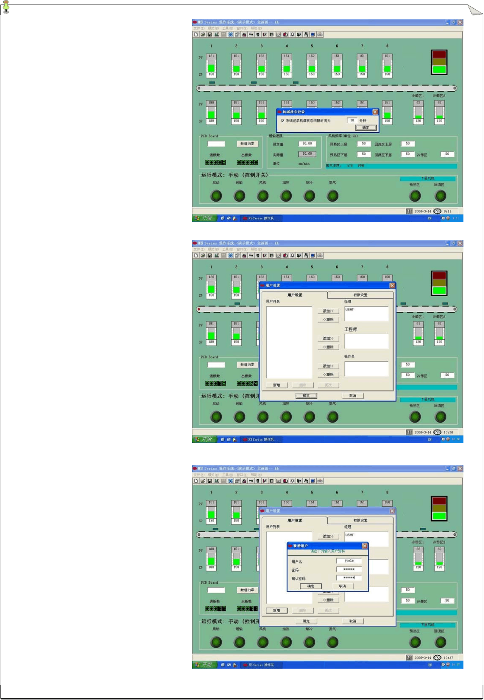 劲拓电子设备有限公司 第 25 页 共 66 页 NS 系列无铅回流焊机用户手册 (A1.0) 2. 选择“ 删除 ”选项时如右图所示, 用户输入所需待删除的用户对应的密 码。按 “确定” 键便将此用户删除了, 注意 :请慎用此选项。 3. 选择 “更改” 选项时,系统将会 弹出如右上图所示的对话框,要求用户 输入此用户原密码,输入完毕后按 “确 定” 键,系统将会显示如右图画面,用 户输入所要更改的密码及确认密码,按 “ 确定 ”键便…