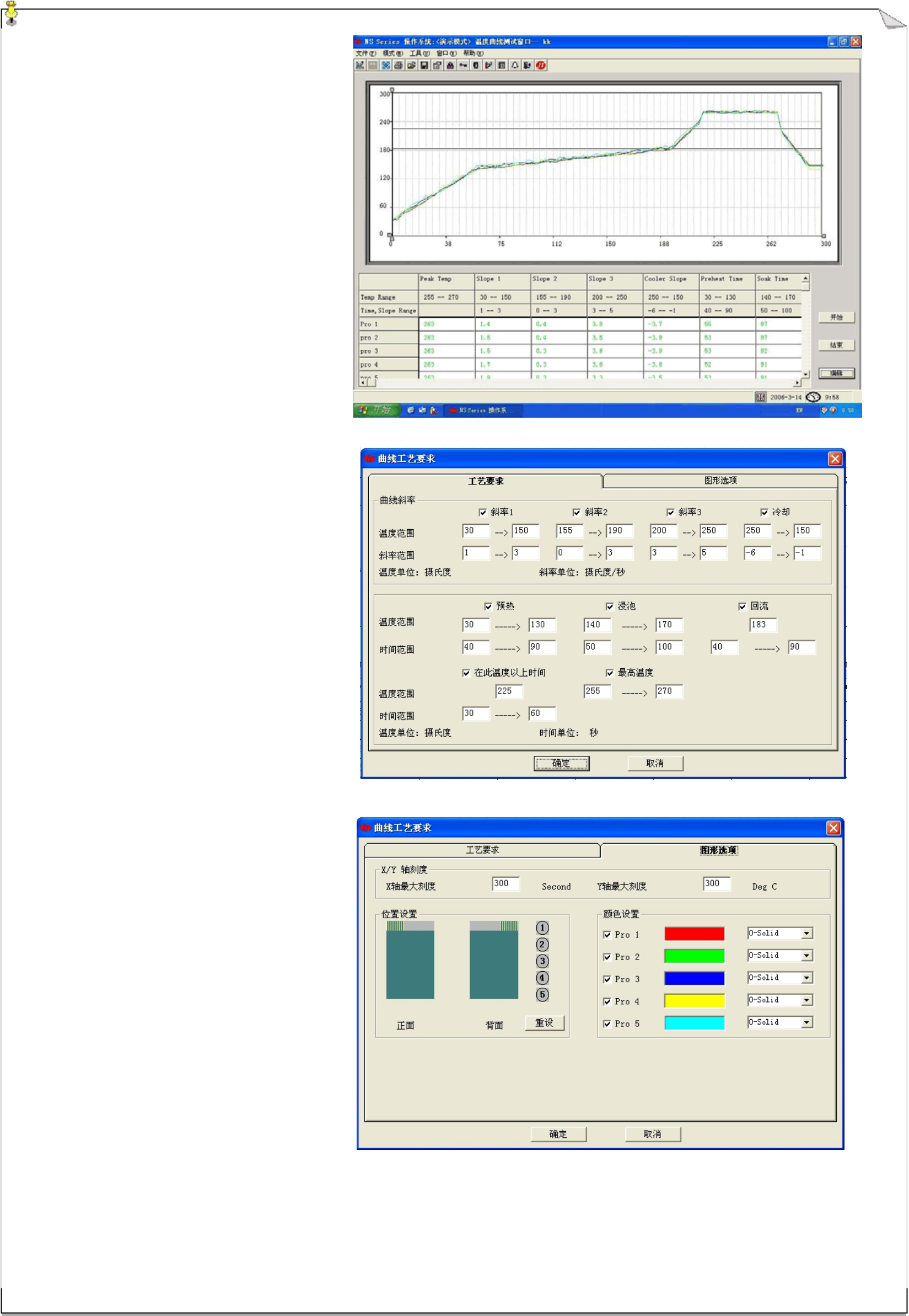 劲拓电子设备有限公司 第 31 页 共 66 页 NS 系列无铅回流焊机用户手册 (A1.0) 7.2.3.17.6 温度曲线测试窗口: 用户采用外接测温头测试 PCB 板 各点的温度时需打开此窗口。 选择 “开始” 选项后,系统会自 动将实时测量并记录各点温度值,在 窗口处同步显示曲线图,测试完后系 统会将用户设定的曲线参数进行运 算,并显示给用户分析。 打印曲线图时,系统会对资料来 分析供用户参考。 如用户要对曲线工艺设定要求,以 …