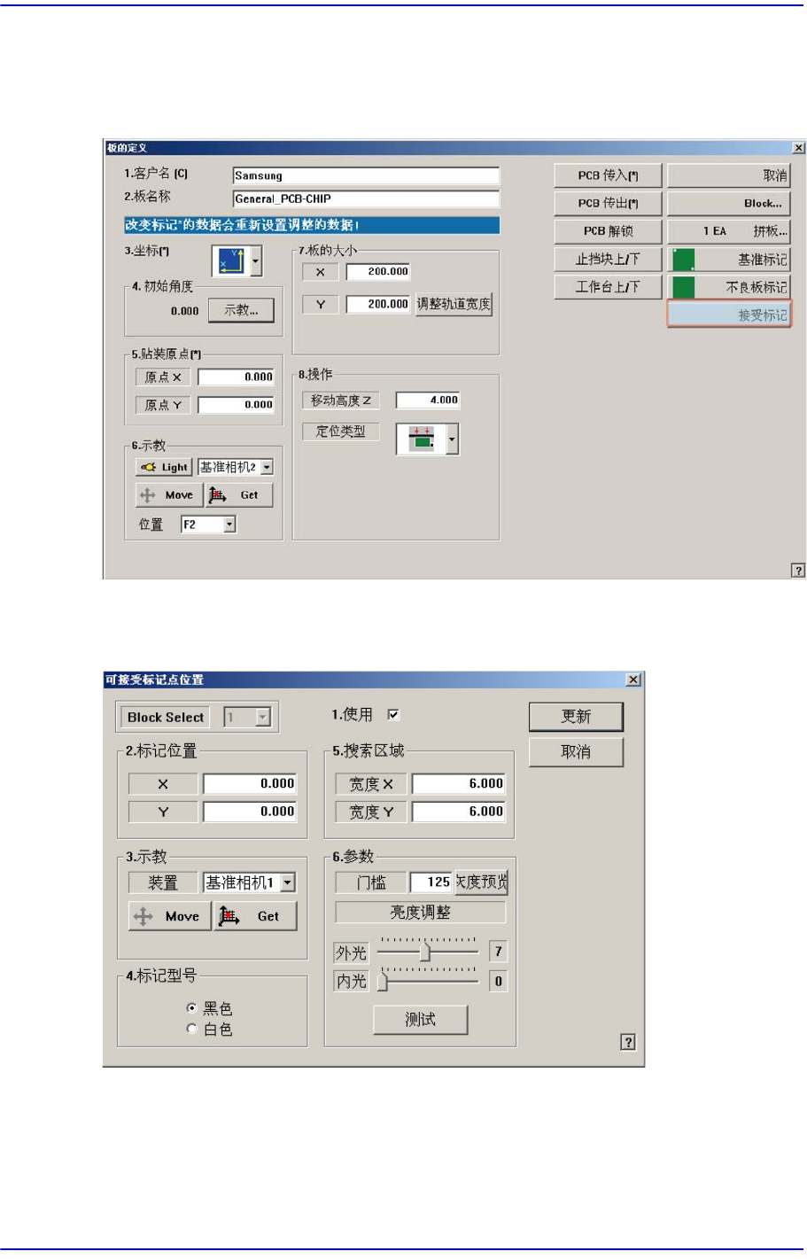 6-32 Fast Flexible Placer SM481( L) Administrator’s Guide 6.5. 接受标记 (Accept Mark) 设置 用来区分安装 s 的 PCB 的合格与否的标记为 坏标记。 坏标记 对不合格品作标记 , 但 可接受标记对不合格不作标记, 同时设备只对 可接受标记标记的 PCB 进行作业。 点击 < 接受标记 > 按钮时, 显示以下编辑可接受标记 数据的对话框。 图 6.…