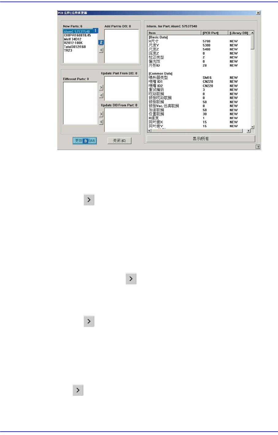 7-5 元件的登记 单击 < 更新 数据 > 按钮把对应部件登录到 Local Part DB 中。 < 改变组 > 按钮 把选择的元件从当前的元件群 变更为另外的元件组。 先选择 <Part L ist> 目录 框所要变更的部件后点击此按 钮。 < 删除元件库 > 按钮 把在 < 元件 清单 > 选择的部品组据从 Local Part DB 删除。 先选择 <P…
