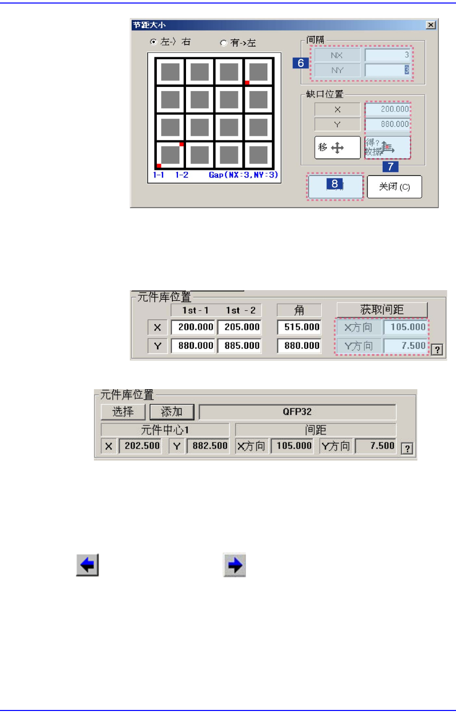 8-27 供应装置的设置 (7) 点击 <G et> 键, 填入拼块 的数值。 (8) 点击 <Apply> 键, 如下图所 示, 可以获得最终的 Pitch 数值。 但是, 如 果已经知道的拼块 Pitch 数值, 可以省略 (6) ~ (8) 的过程, 在 窗口内直 接输入。 < 使用 JEDEC DB> < 选择 > 按钮 带来从 JE DEC T ray DB 正在作业的多…