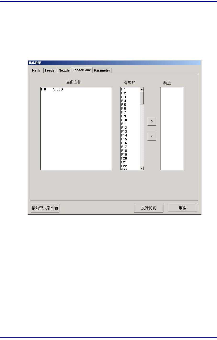 10-8 Fast Flexible Placer SM481( L) Administrator’s Guide < 取消 > 按钮 取消上述选择的选项并关闭对话 框。 10.4. Feeder Lane 图 10.5 " 优化设置 : FeederLane" 对话框 此对话框设定用于优化喂料器配置 的 喂料器通道。 配置在 喂料器通道的装置 包括 带式喂料器 , 可布置 Fe eder Lane …