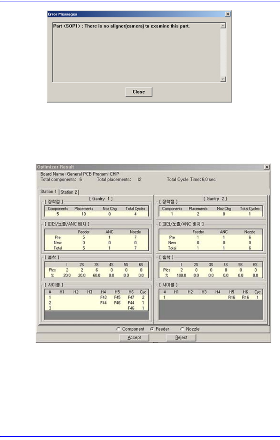 10-17 Optimization 于模拟的估测值, 由于不包括部品识别不良等 要素, 可能 会与设备实际装贴时 间多少有些差异。 <Arrangement> 领域 在这部分显示带式喂料器, ANCs 和吸嘴的配置状态。 Pre: 使用者 直接配置的数量 New: 表示在优化重新配置的 数量 T otal: 总的配置数量 <Pickup> 领域 在这部分显示部品同时吸取的分布 。 在这部分 …