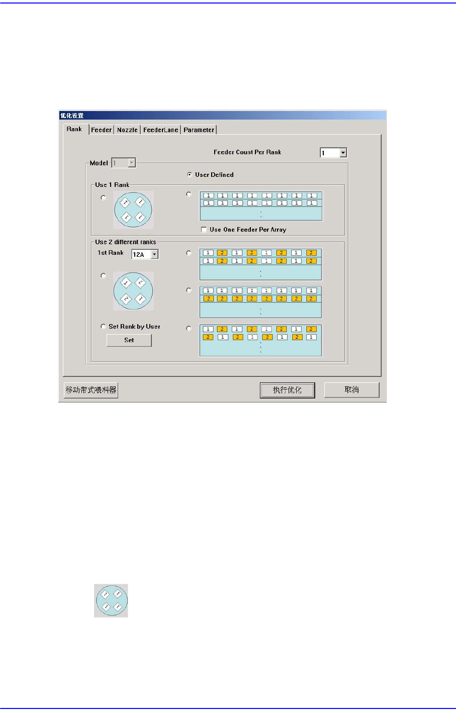 12-12 Fast Flexible Placer SM481( L) Administrator’s Guide 12.4. Optimization 12.4.1. 优化 根据照明用 PCB 的特性按照 LED 的等级 (Rank) 自动地为贴装点配置供料器。 图 12.3 “ 优化设置 : Rank” Tab 对话框 该对话窗口允许使用者根据 LED 照明用 PCB 的特性选择作业类型而优 化供料器配 置。 一般来说, 如 果需…