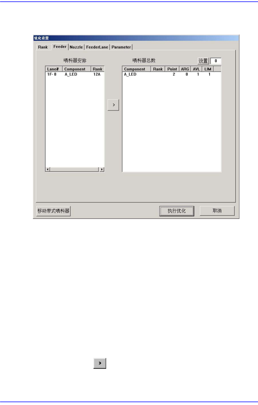 此对话框是为带式喂料器的最佳配置所设定的。 带式喂料器考虑在Optimizer的同