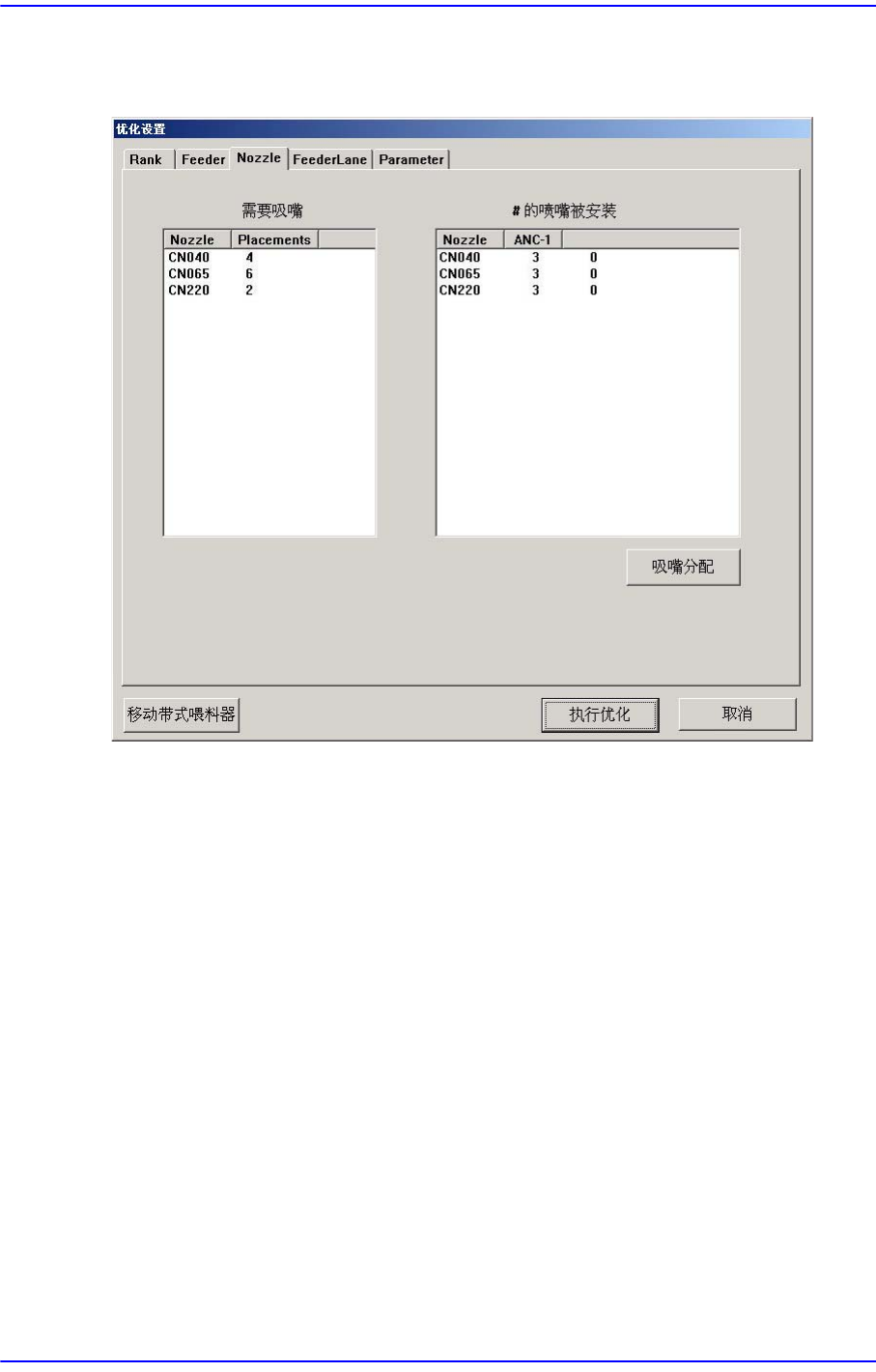 12-16 Fast Flexible Placer SM481( L) Administrator’s Guide 12.4.3. Nozzle 图 12.5 " 优化设置 : 吸嘴 " 对话框 显示吸嘴配置有关信息的画面。 < 需要吸嘴 > 目录箱 在此目录框表示部件的贴装所 必要的喷嘴种类及各喷嘴的使用次 数。 <Nozzle> 栏 表示喷嘴名称。 <Placement…