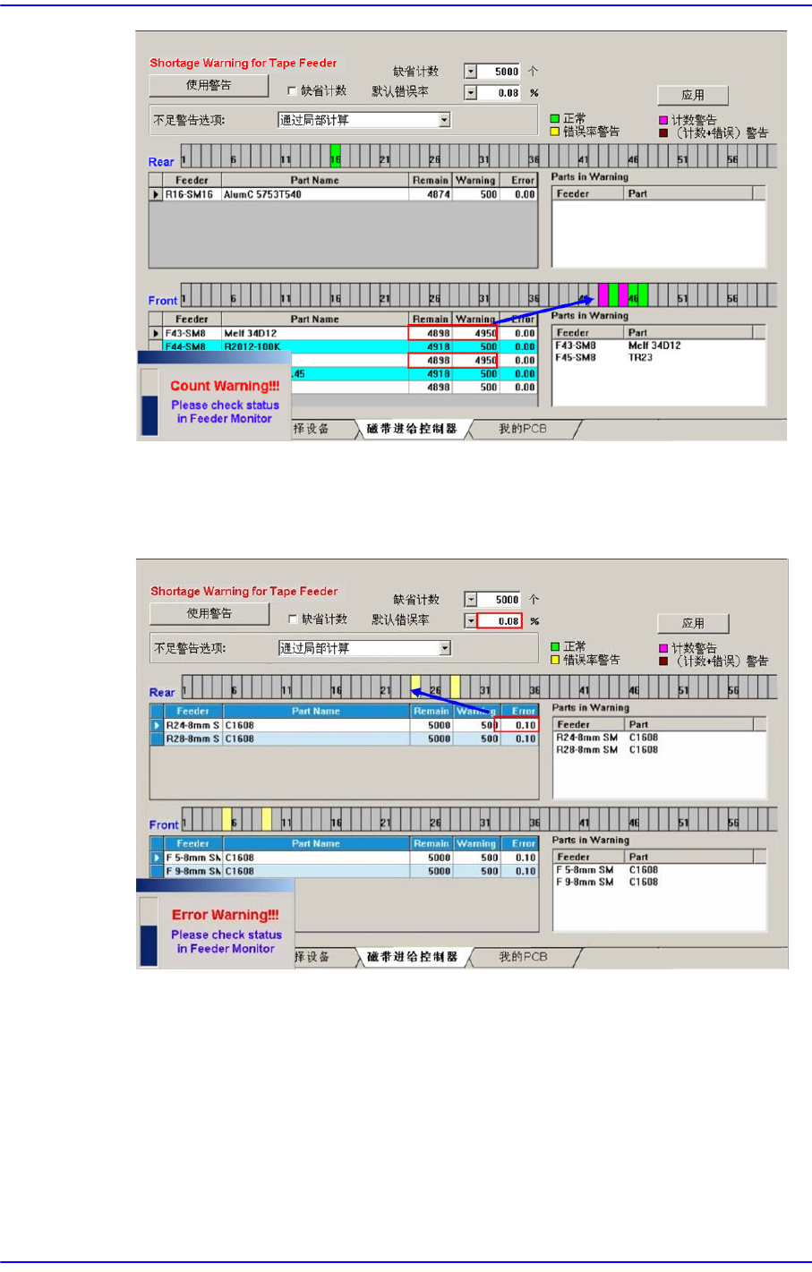 显示已贴装Tape Feeder 的部件剩余量,可设置警告部件不足的部件剩余量,监控与