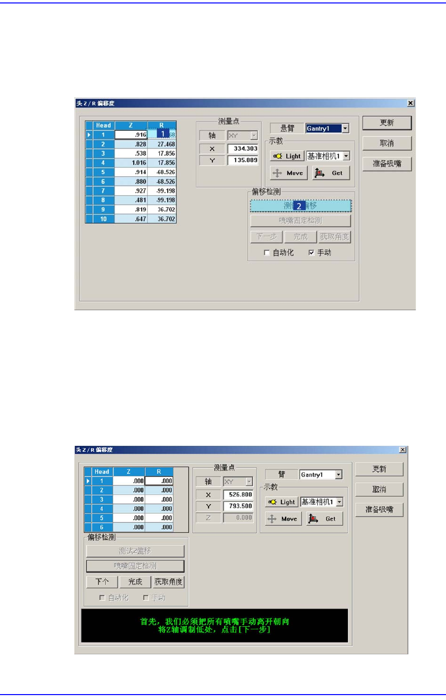 14-47 Machine Calibration 下面介绍 R Of fset Calibration 执行方法。 1. 需要在 <Grid> 领域执行校正的 Head 的 R 轴值输入 “0” 。 2. 在 <Grid> 领域点击要执行校正 Head 的 R 轴, 再点击 < 喷嘴固定检 测 > 按钮。 ( 在 这里任意用 Head 1 设定 ) 3. 显示 “ 请检测和记录喷嘴 CNT0 到 A…