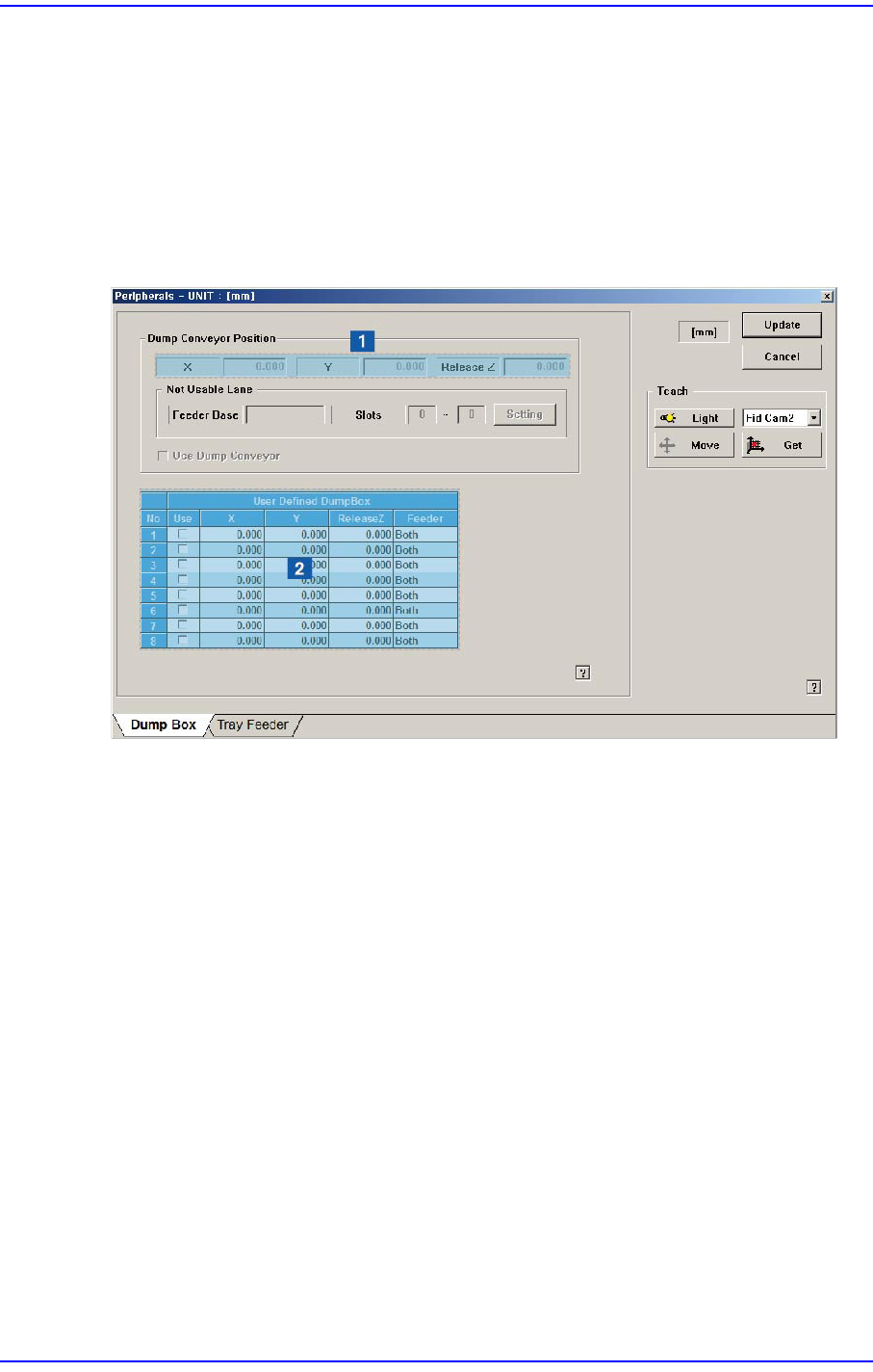 15-10 Fast Flexible Placer SM481( L) Administrator’s Guide 15.2.2. < 系统堆存处 > TAP 对话框 设定与吸附部件回收厢 Dump Box 有关的数据。 图 15.6 “ 系统堆存处 ”TAP 对话框 < 系统默认垃 圾箱 > 领域 输入系统回收箱位置。 < 垃圾桶 > 组合 框 选择要设置的 Dump Box 。 &l…
