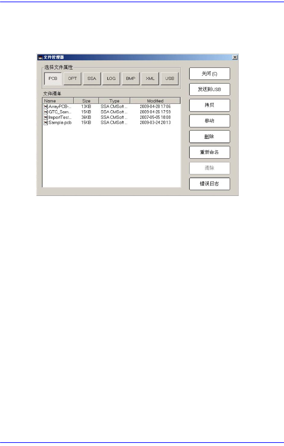 17-8 Fast Flexible Placer SM481( L) Administrator’s Guide 17.4. 文件管理器 ( File Man… ) [F5] 为 PCB 文件复制、 移动及删除等 文件管理提供便利。 图 17.6 “ 文件管理器 ” 对话框 < 选择文件属 性 :> 领域 如果点击选择文件属性领域扩 展名文件按钮, 就会列出相关内容的文件。 < 发送到 USB> 按钮 …