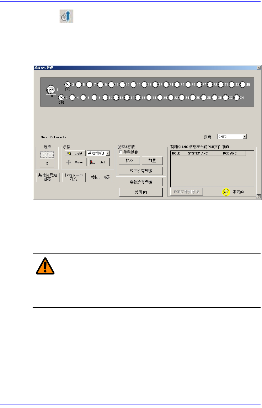警 告 如果需要手动配置吸嘴,使用<打开开闭器>按钮打开ANC开