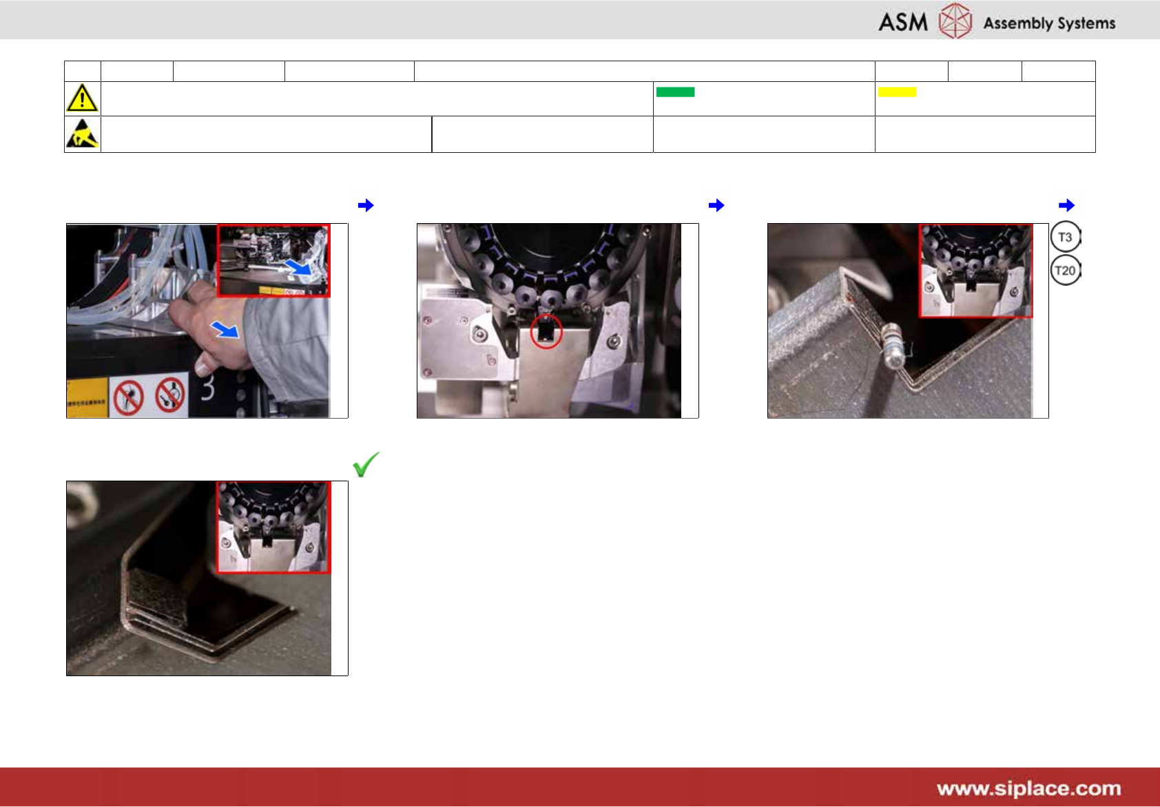 3 每周 X_系列 S 贴片头 **Z*(C&P20P) 2 分钟 1/1 注意开始维护前,请参阅用户手册中的安全说明 贴片机状态开启 传送系统空 注意!遵守防静电守则 工具: T3、T20 易损件: 耗材: 1 将悬臂移到极限位上 2 需清洁的贴片头部位 3 检查并清除 Z 轴里的所有的元件 4 如果正常 → 下一项任务