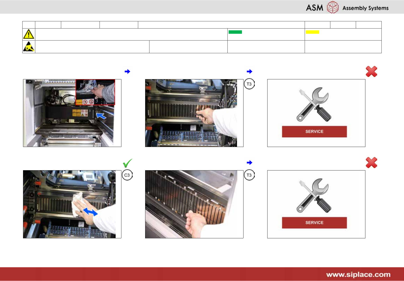 4 每周 X_系列 S 悬臂 *****X*Y****** 8分钟 1/2 注意开始维护前,请参阅用户手册中的安全说明 贴片机状态开启 传送系统空 注意!遵守防静电守则 工具: T3 易损件: 耗材: C3 1 将 2 号和 4 号料台上的所有悬臂移到极 限位上 2 检查悬臂 1/3 (2/4) 的 X 轴磁体上是否 有污染和破损 3 如发现任何损坏请联系维修人员 4 如果正常,则清洁悬臂 1/3 (2/4) 的所有 X-…