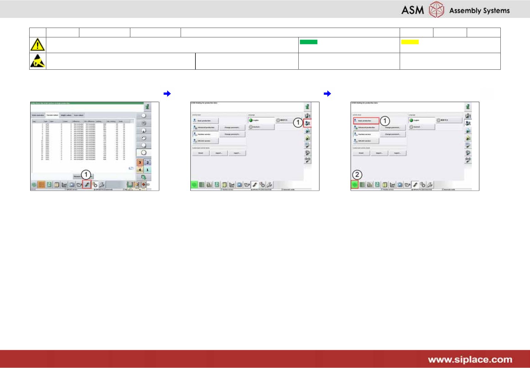 9 每周 X_系列 S 贴片头 ****** 5分钟 1/2 注意开始维护前,请参阅用户手册中的安全说明 贴片机状态开启 传送系统空 注意!遵守防静电守则 工具: 易损件: 耗材: 1 单击 (1),然后单击 (2) 2 点击 (1) 3 点击 (1) 4 检查真空值 (1) 5 如不正常,请联系维修人员 6 如正常,则为其他贴片头 (1) 重复步骤 1-4