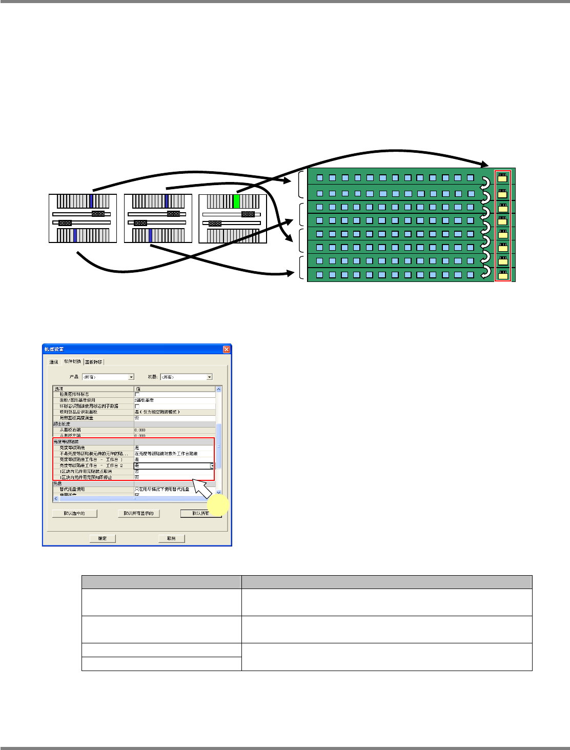 NPM-DGS 程序手册 13.1 等级贴装功能 ECS9AC-MB-13P-02 Page 13-9 ③ 在各工作台上配置等级贴装元件和其他元件时 在这里,对将等级贴装元件和其他元 件也配置到各工作台上时的数据 编制方法进行说明。 基本上与分别配置等级贴装元件的操 作相同, 但是需要对其他元件也进行与等级贴装元件相同的 优 先顺序设定。 实装元件为等级贴装元件和其他元件 在各工作台上配置等级贴装元件和其 他元件 在工作台上…