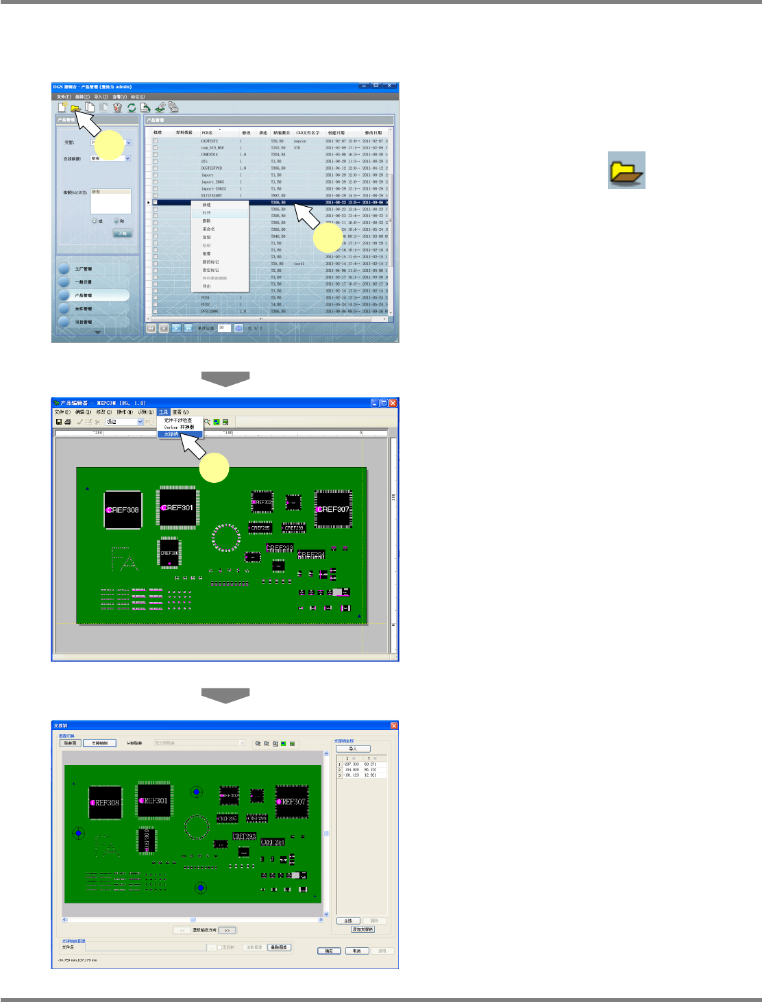 NPM-DGS 程序手册 13.2 支撑销配置数据的编制功能 Page 13-18 ECS9AC-MB-13P-02 支撑销画面的详细 ① ‘ 画面切换 ’ 切换显示画面。 [ 贴装面 ] : 将画面切换到贴装面。 [ 支撑销侧 ] : 将画面切换到支撑销侧。 ② ‘ 支撑销坐标 ’ 显示设定在基板上的支撑销的坐标。 [ 导入 ] : 从 PCB 或生产数据导入支撑销坐标。 [ 全选 ] : 选择全部的支撑销。 [ 删除 ] : 删…