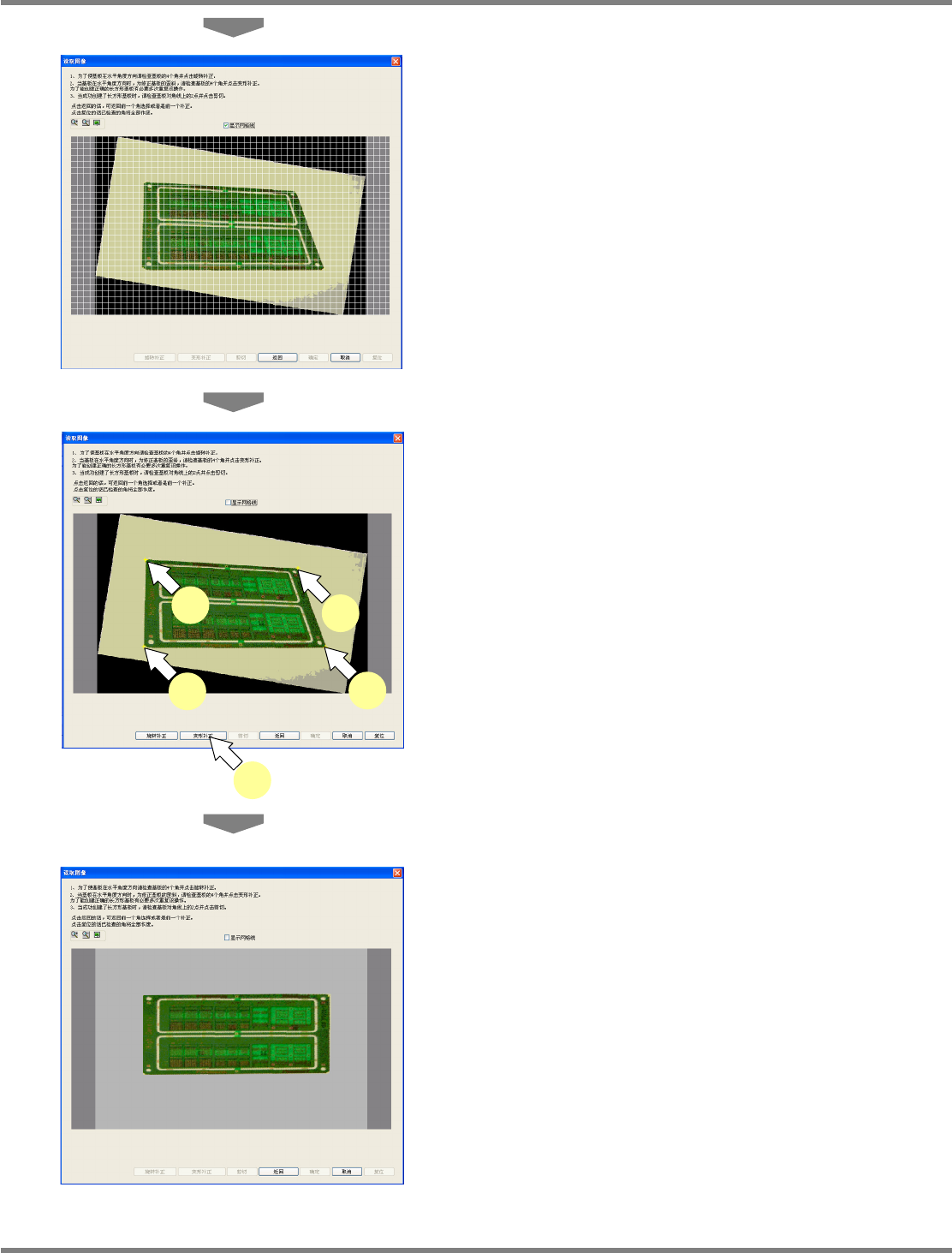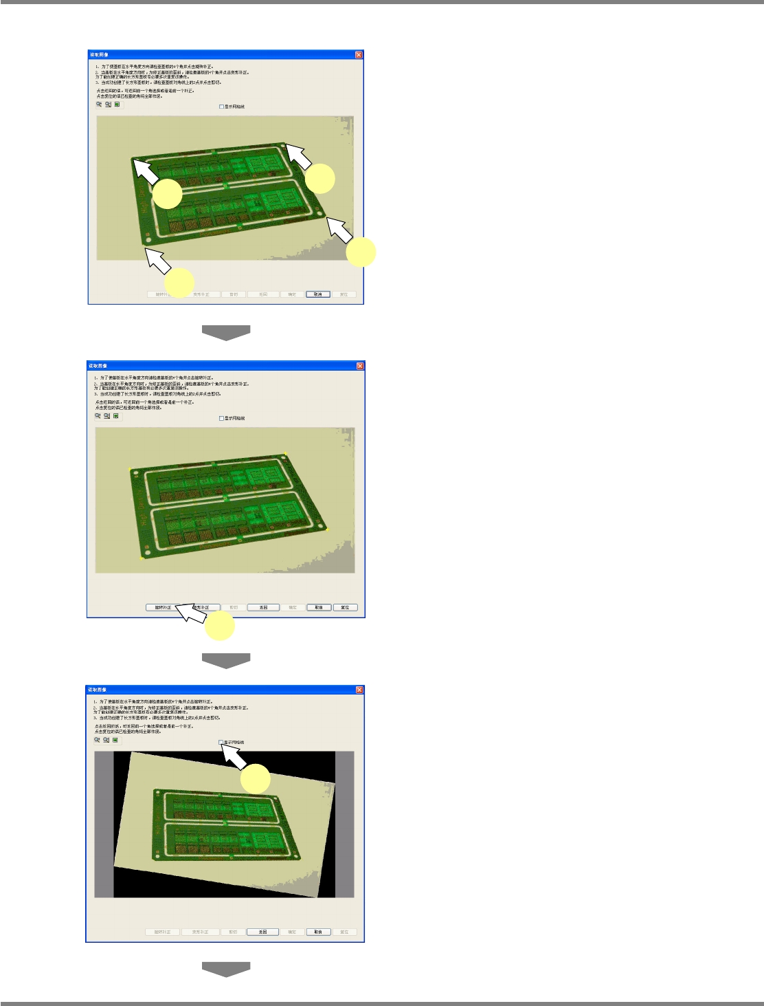 NPM-DGS 程序手册 13.2 支撑销配置数据的编制功能 ECS9AC-MB-13P-02 Page 13-23 ③ 读取图像的补正 1 点击基板的四个角。 在点击的部位上将会显示 + 字标记。 2 点击 [ 旋转补正 ] 。 将进行图像的旋转补正。 旋转大的图像,需要进行数次补正。 3 勾选 ‘ 显示网格线 ’ 。 Howto130205S-3 9C00 2 Howto130205S-4 0C00 3 Howto130…