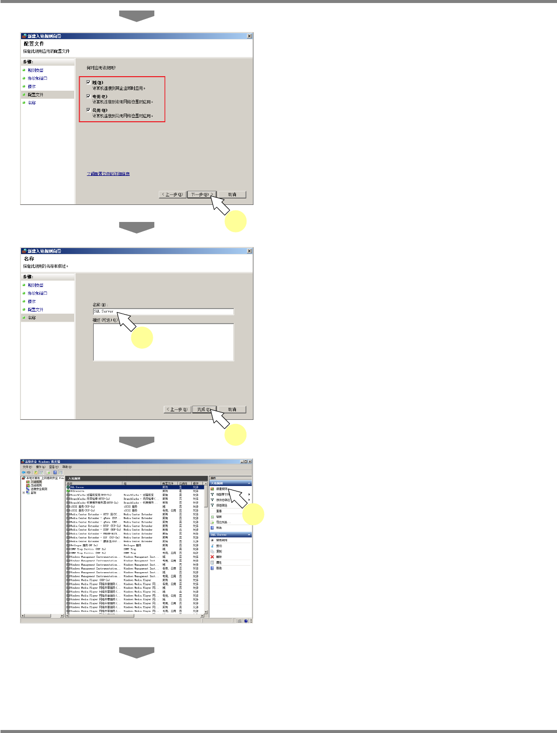 NPM-DGS 程序手册 2.4 与 LNB 连接 EJS9AC-MB-02P-01 Page 2-73 7 点击 ‘ 端口 ’ 的确认按钮。 8 点击 [ 下一步 ] 。 9 点击 ‘TCP’ 的确认按钮。 10 点击 ‘ 特定本地端口 ’ 的确认按钮。 11 在 ‘ 特定本地端口 ’ 中输入 ‘1433’ 。 12 点击 [ 下一步 ] 。 13 点击 ‘ 允许连接 ’ 的确认按钮。 14 点击 [ 下一步 ] 。 Other020…