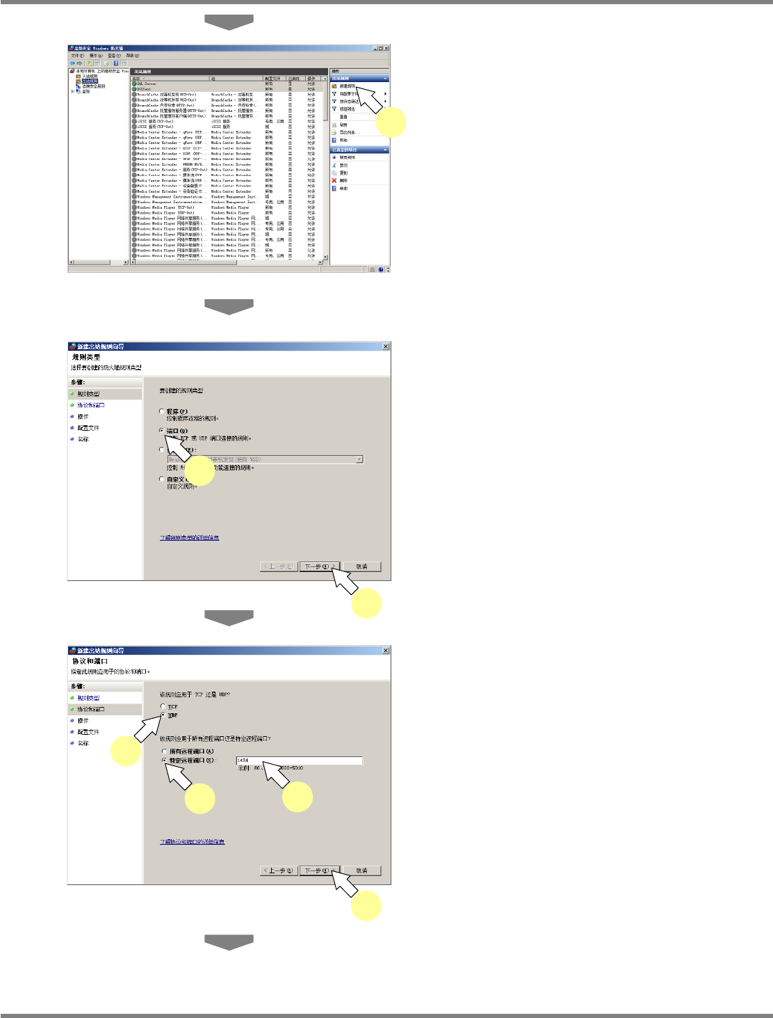 NPM-DGS 程序手册 2.4 与 LNB 连接 Page 2-80 EJS9AC-MB-02P-01 51 点击 ‘ 允许连接 ’ 的确认按钮。 52 点击 [ 下一步 ] 。 53 点击 [ 下一步 ] 。 请确认三个项目都已被选择。 54 在 ‘ 名称 ’ 中输入任意的文字列。 ( 例如 : SQL Server Brower) 55 点击 [ 完成 ] 。 Other020402S- 33C00 51 52 Other02…