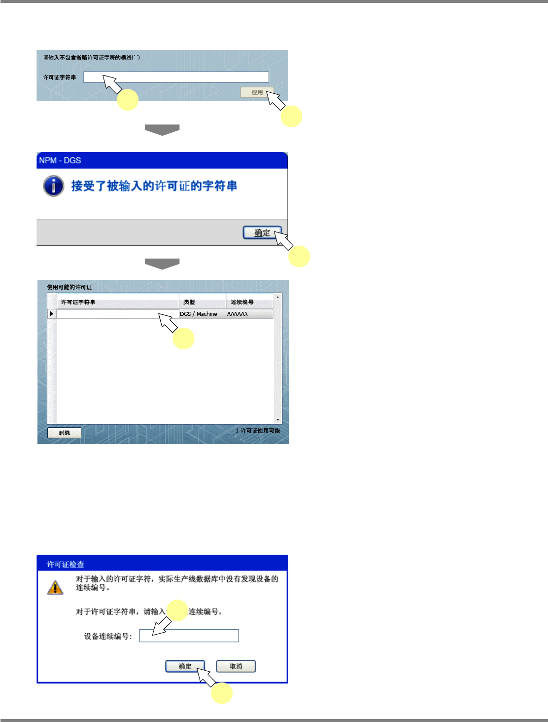 NPM-DGS 程序手册 3.2 关于环境设定画面 Page 3-6 EJS9AC-MB-03P-01 离线元件数据编制许可证的设定方法 使用离线相机单元,无需设定许可证 。 1 在 [ 许可证字符串 ] 文本框里输入许可证 列表上所记载的离线元件数据编制的 许可证字符串。 ( 选项表中记载的选项 编号 ) 2 点击 [ 应用 ] 。 3 点击 [ 确定 ] 。 4 对 [ 使用可能的许可证 ] 栏里显示的许可 证列表追加在上述…