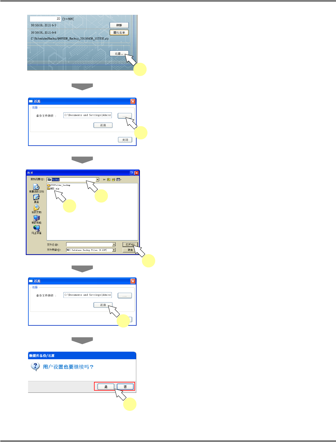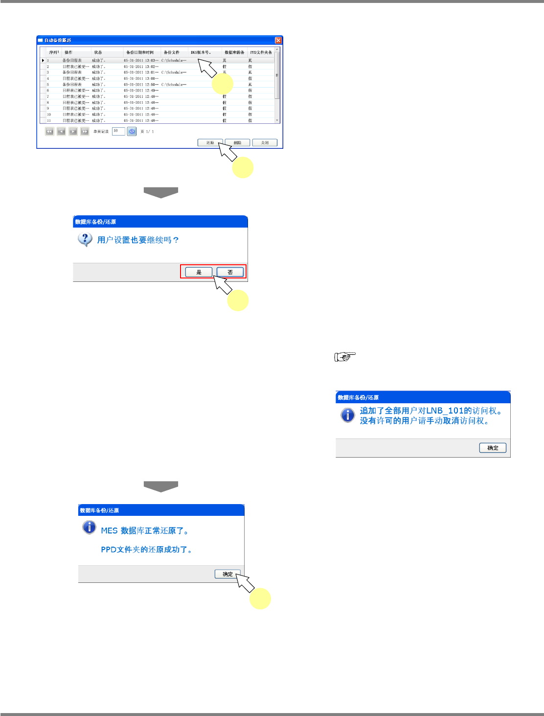 NPM-DGS 程序手册 3.2 关于环境设定画面 EJS9AC-MB-03P-01 Page 3-21 ② 通过自动备份履历进行还原 1 从一览中选择需要还原的备份文件后, 点击 [ 还原 ] 。 将显示确认画面。 2 选择是否继续进行用户设置。 将实施数据的还原。 [ 是 ] : 在继续备份数据的用户设定的状态下 还原 [ 否 ] : 在维持 DGS 的用户设定的状态下还原 没有继续时,将会显示下述信息,并 针对在备 份…