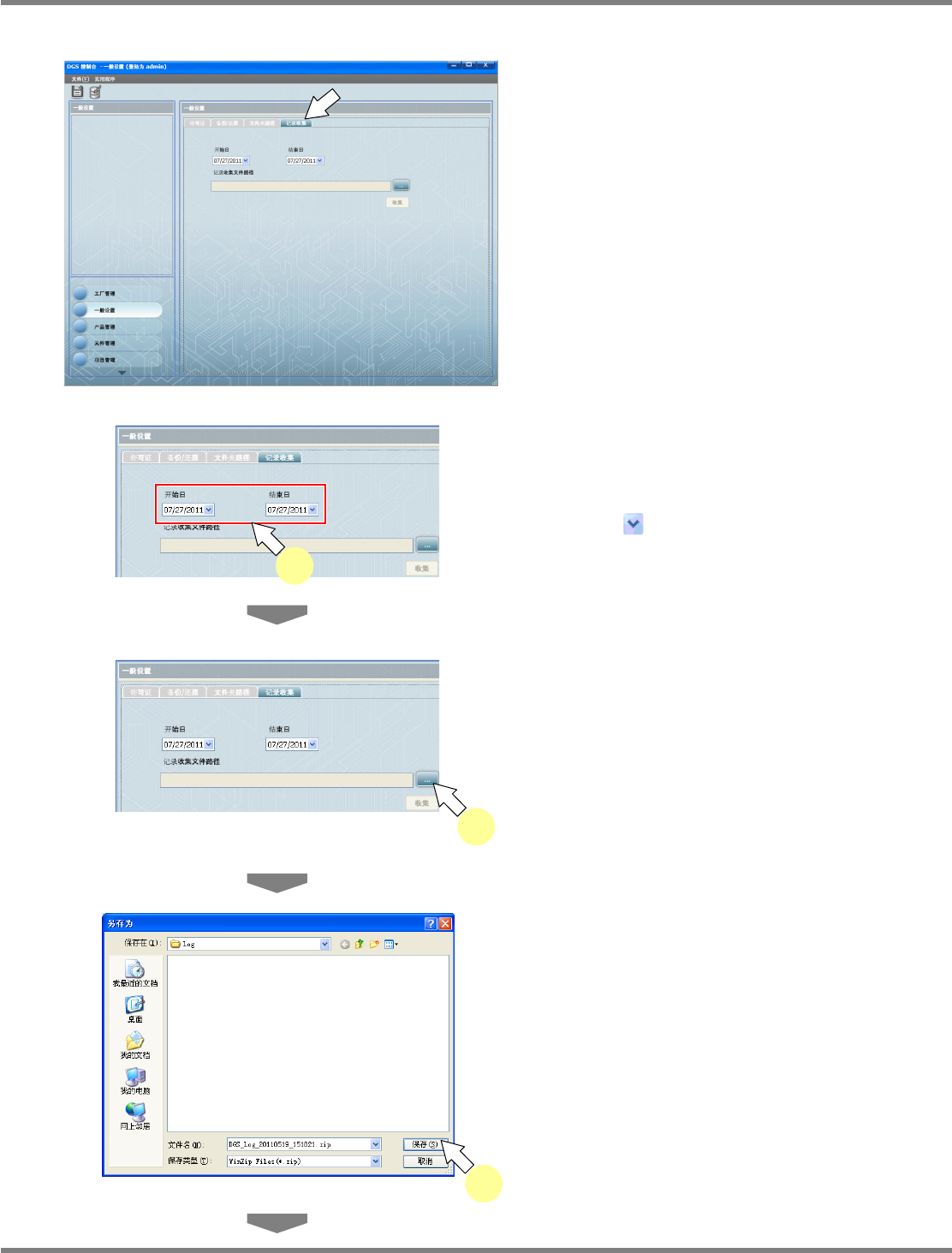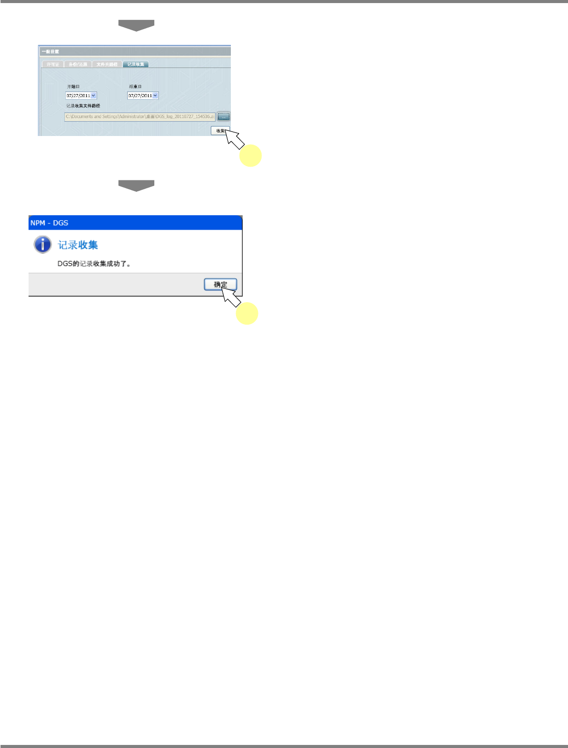 NPM-DGS 程序手册 3.2 关于环境设定画面 Page 3-26 EJS9AC-MB-03P-01 4 点击 [ 收集 ] 。 5 点击 [ 确定 ] 。 即会在指定的文件夹内保存纪录文件 。 收集纪录的步骤如上所示。 请将所搜集到的纪录写进 CD-ROM 等媒体后, 寄送给本公司的售后服务部门。 Environment03 0102S-06C00 5 Environment03 0204S-03C00 4