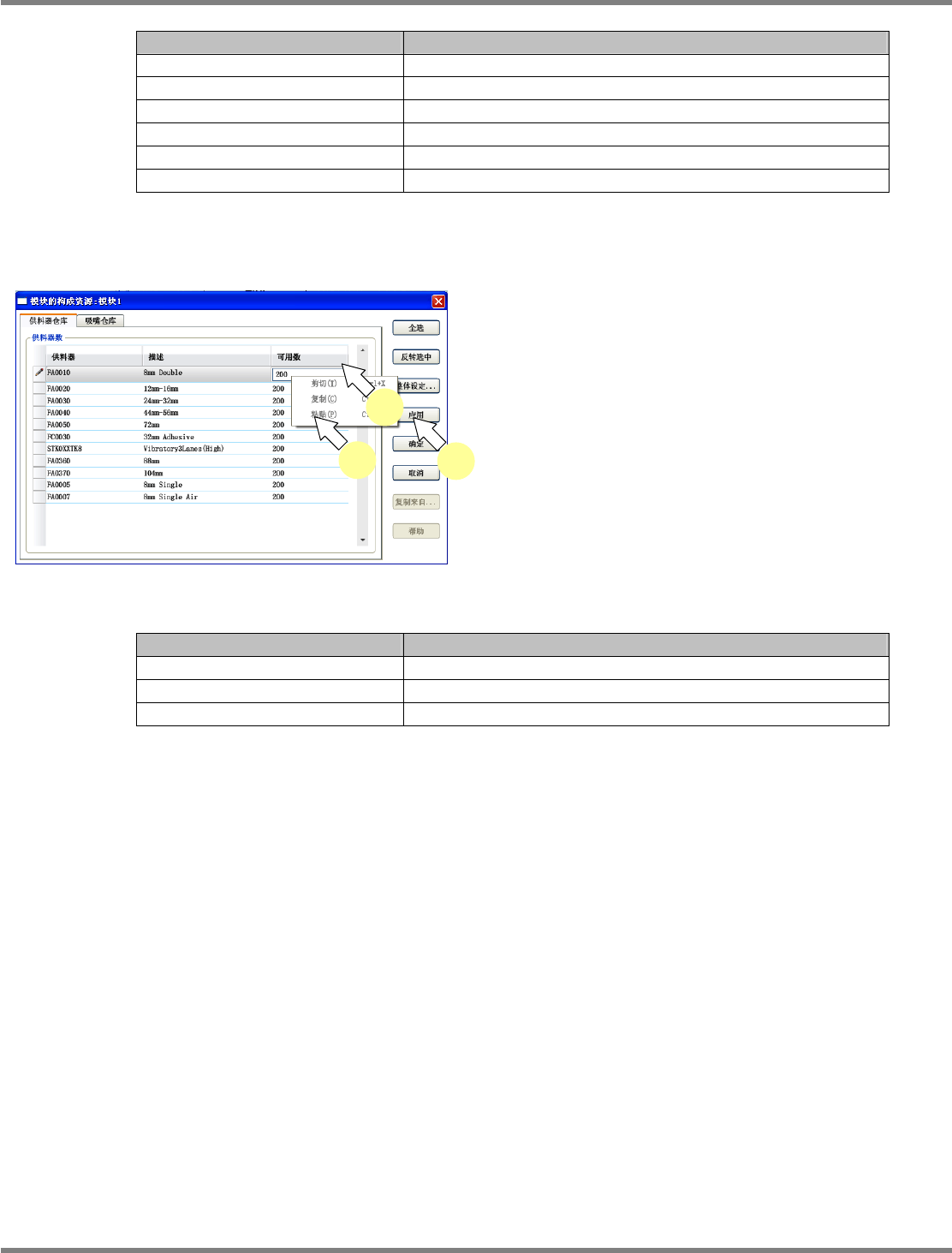 NPM-DGS 程序手册 4.9 吸嘴仓库 EJS9AC-MB-04P-04 Page 4-75 4.9 吸嘴仓库 吸嘴总数的设定 在供料器仓库画面上打开吸嘴仓库画 面,编辑各吸嘴类别的总数。 1 点击 [ 吸嘴仓库 ] 标签。 显示出吸嘴仓库画面。 2 从 ‘ 吸嘴 ’ 栏中选择吸嘴。 3 在 ‘ 可用数 ’ 栏里输入拥有的吸嘴数。 4 点击 [ 确定 ] 。 设定项目 项目 说明 ‘ 吸嘴 ’ 用吸嘴程序库编辑器设定的吸…