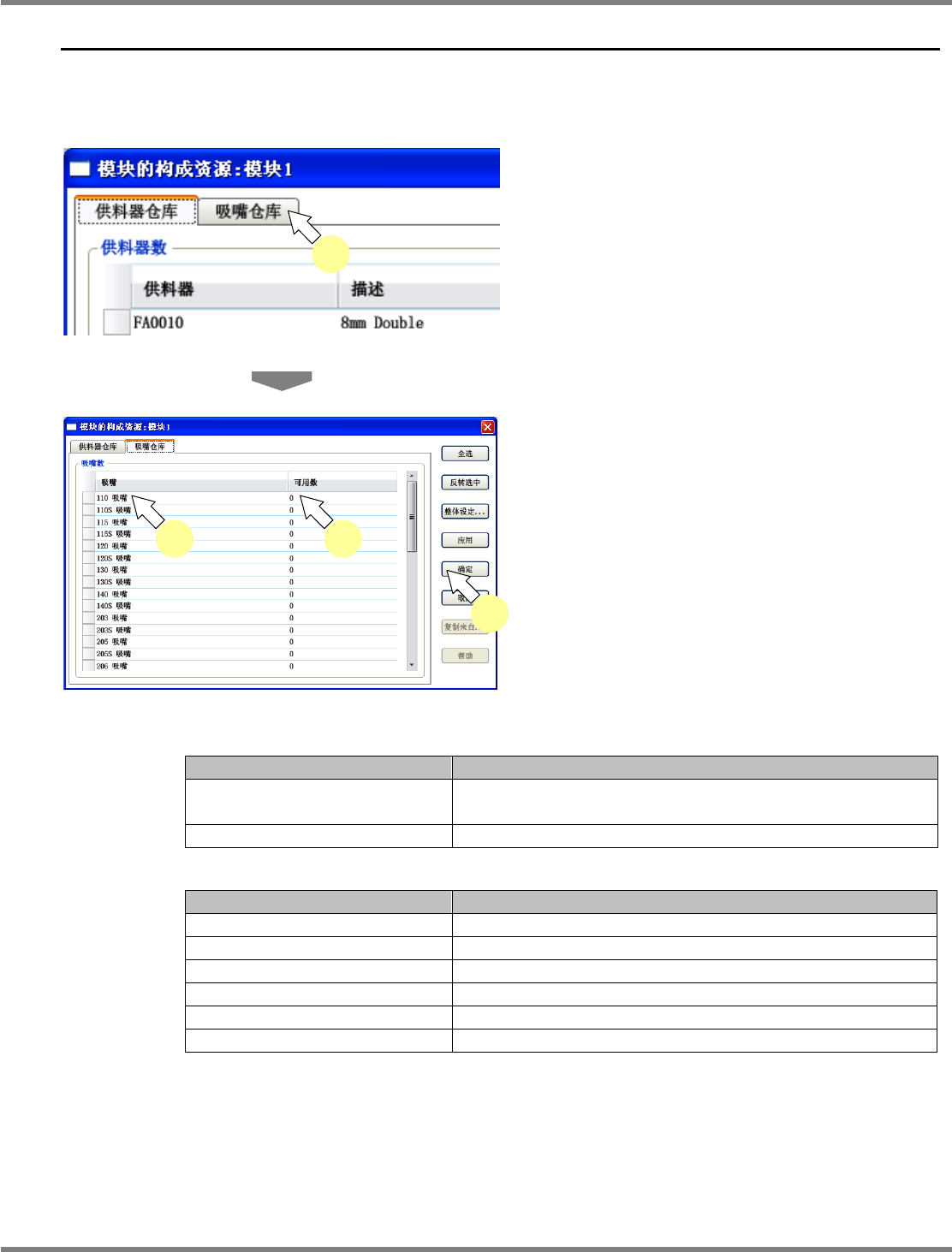 在供料器仓库画面上打开吸嘴仓库画面,编辑各吸嘴类别的总数。