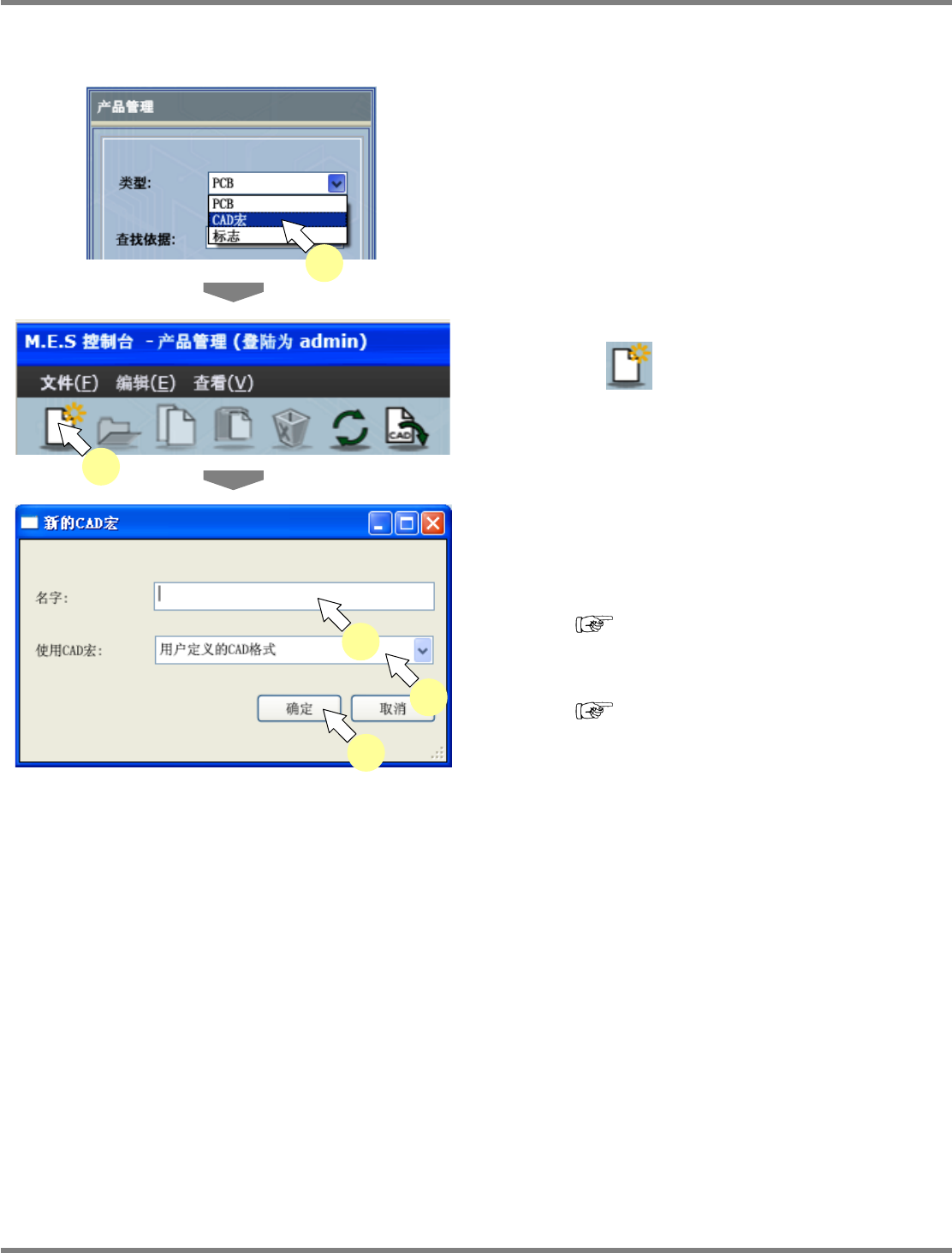 NPM-DGS 程序手册 5.2 CAD 宏的定义 Page 5-16 EJS9AC-MB-05P-03 定义 CAD 宏 1 选择画面左上处导航区域的 ‘ 类型 ’ 字段 的 [CAD 宏 ] 。 2 选择菜单栏的 [ 文件 ] [ 新建 ] ,或者工 具栏的 ( 新建 ) , 或者在右击菜单 中选择 [ 新建 ] 。 将会显示 < 新的 CAD 宏 > 画面。 3 输入新的 CAD 宏名字。 用户定义的 …