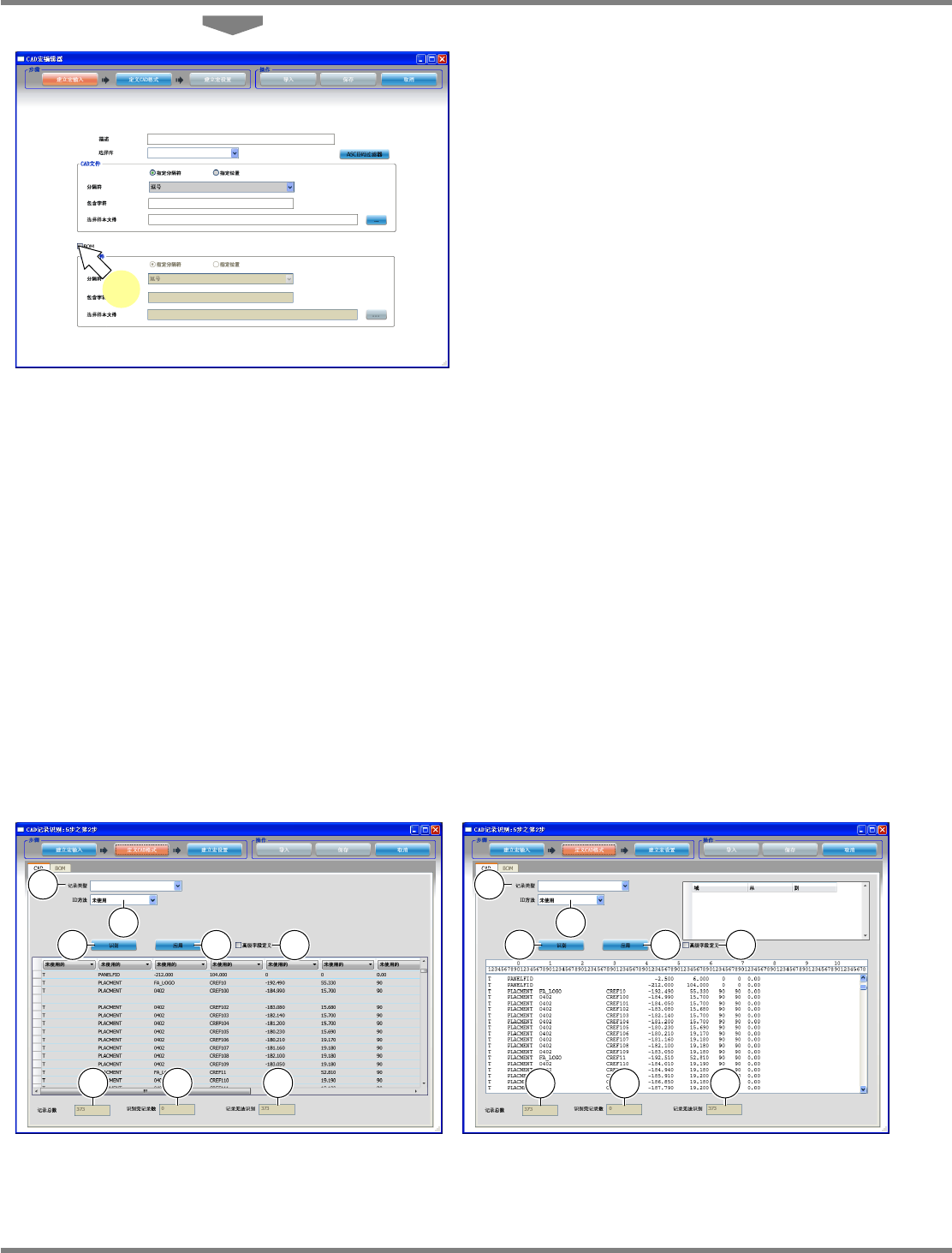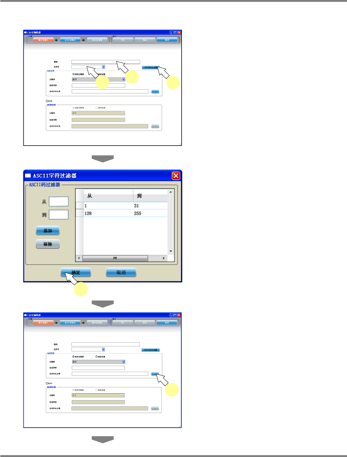 NPM-DGS 程序手册 5.2 CAD 宏的定义 EJS9AC-MB-05P-03 Page 5-23 设定输入文件 1 在 ‘ 描述 ’ 栏中输入宏的详细说明。 请记述要进行定义的宏的有关说明。 ( 任意 ) 2 选择将获取的元件链接到的元件程序 库。 3 为了特定在导入时无视的 ASCII 字符, 点击 [ASCII 码过滤器 ] 。 将会显示 <ASCII 字符过滤器 > 画面。 4 添加无视的 ASCI…