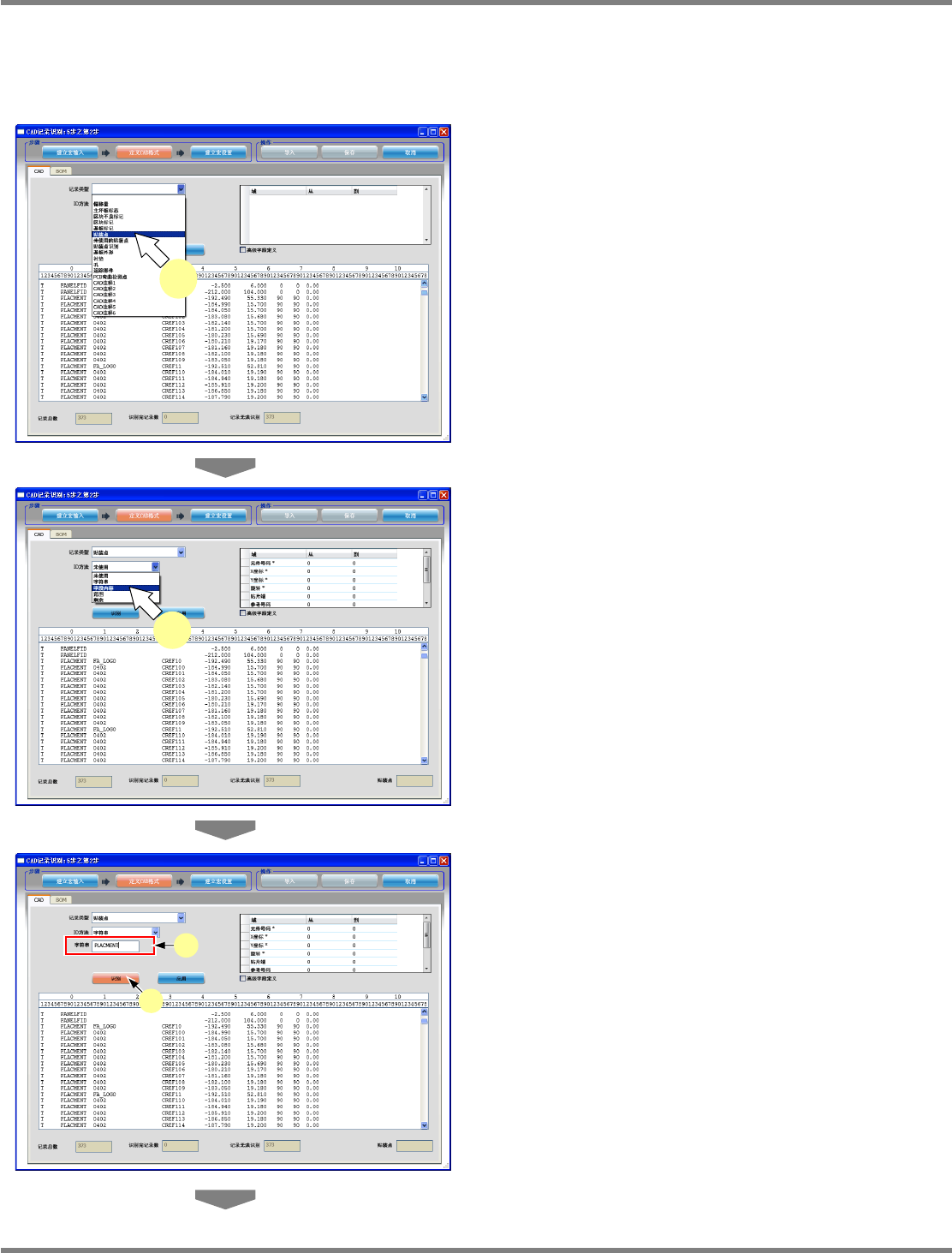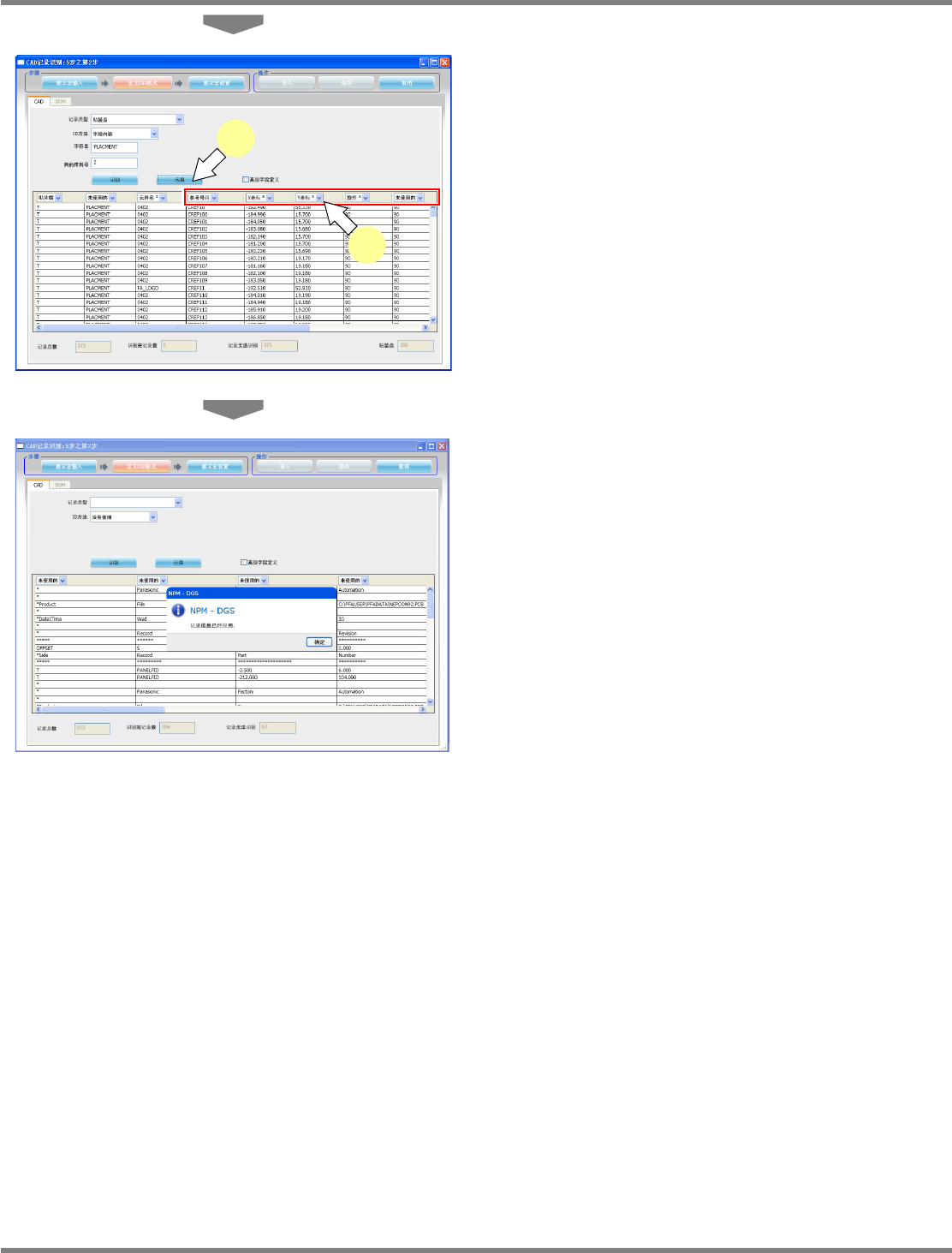 NPM-DGS 程序手册 5.2 CAD 宏的定义 EJS9AC-MB-05P-03 Page 5-37 使用位置指定 CAD 文件时的 CAD 格式的定义 1 选择定义的记录类型。 关于可设定的 ‘ 记录类型 ’ ,请参照 ‘5.2.1 CAD 宏编辑器 ’ ‘2. CAD 格式定义 ’ ‘ CAD 标签 ’ ‘ 记录类型和字段定义的关系 ’ 。 我们推荐首先定义实装点记录。 显示出来的字段,根据选…