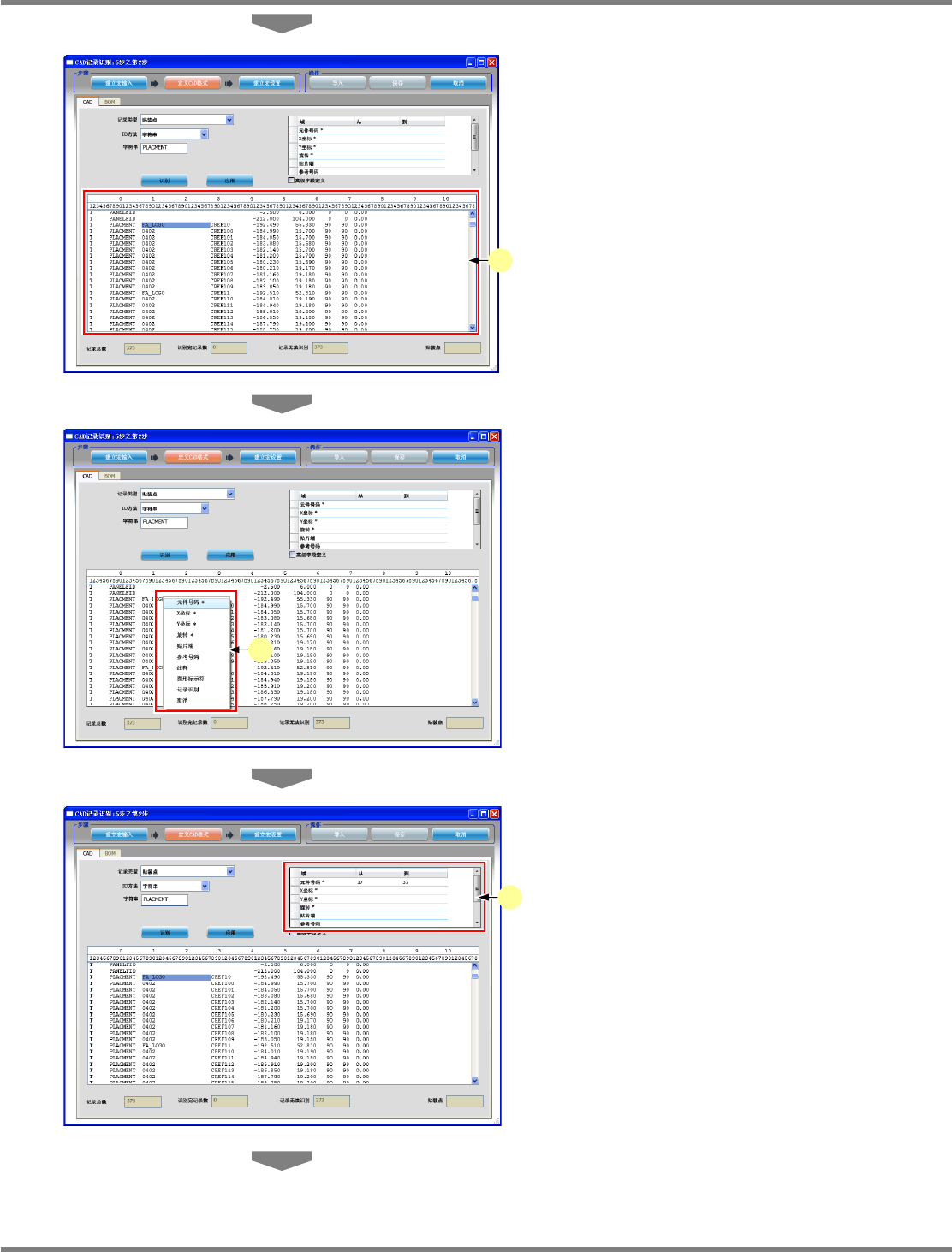 NPM-DGS 程序手册 5.2 CAD 宏的定义 Page 5-38 EJS9AC-MB-05P-03 CAD 宏定义例 对从位置指定 CAD 文件中抽出实装点所需的定义例 进行说明。 在 CAD 文件中,若有包含字符串 ‘PLACMENT’ 的记录,则将其当作实装点的定义 。 1 选择定义对象。 选择 ‘ 记录类型 ’ 的 [ 贴装点 ] 。 2 对抽出条件进行定义。 选择 ‘ID 方法 ’ 的 [ 字段内容 ] 。 a…