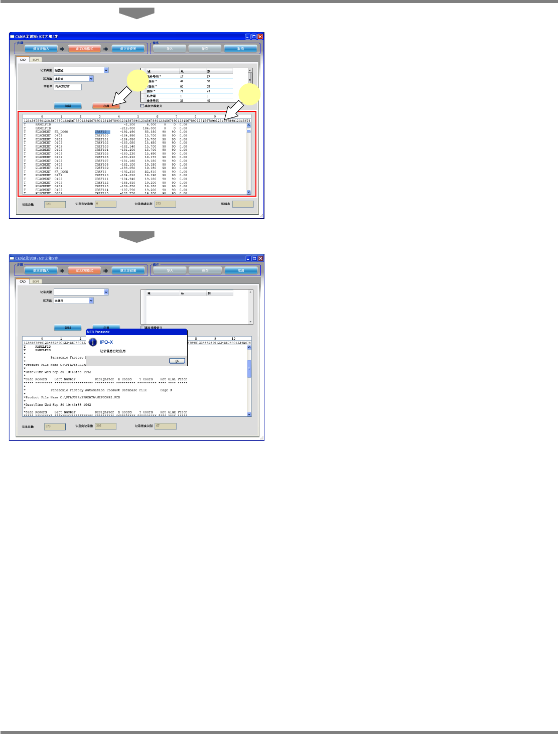 NPM-DGS 程序手册 5.2 CAD 宏的定义 Page 5-40 EJS9AC-MB-05P-03 4 通过同样操作对其它字段也进行定义。 • X 坐标 (49 位数 ~ 58 位数 ) • Y 坐标 (60 位数 ~ 69 位数 ) • 旋转 (71 位数 ~ 74 位数 ) 5 应用定义。 按 [ 应用 ] 即可保存定义。 请重复进行上述操作, 按照每个记录类型分开进 行定义。 Project050201S-5 3C00 …