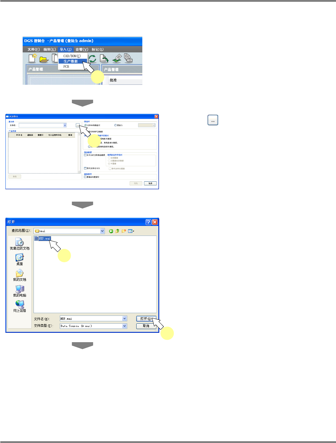 NPM-DGS 程序手册 5.6 生产数据的 PCB 导入 EJS9AC-MB-05P-03 Page 5-99 5 请确认源文件在 PT200 中是否进行数 据检查后,单击 [ 确定 ]. 因为源文件不正常就不能被正确导入 ,请务必 在 PT200 中进行数据检查。 6 点击 [ 导入 ] 。 选择执行导入的 PCB 时,请在 ‘PCB 名 ’ 左侧的 复选框内打勾。 初期显示为全部选择状态。 覆盖已有的 PCB 名称的数…