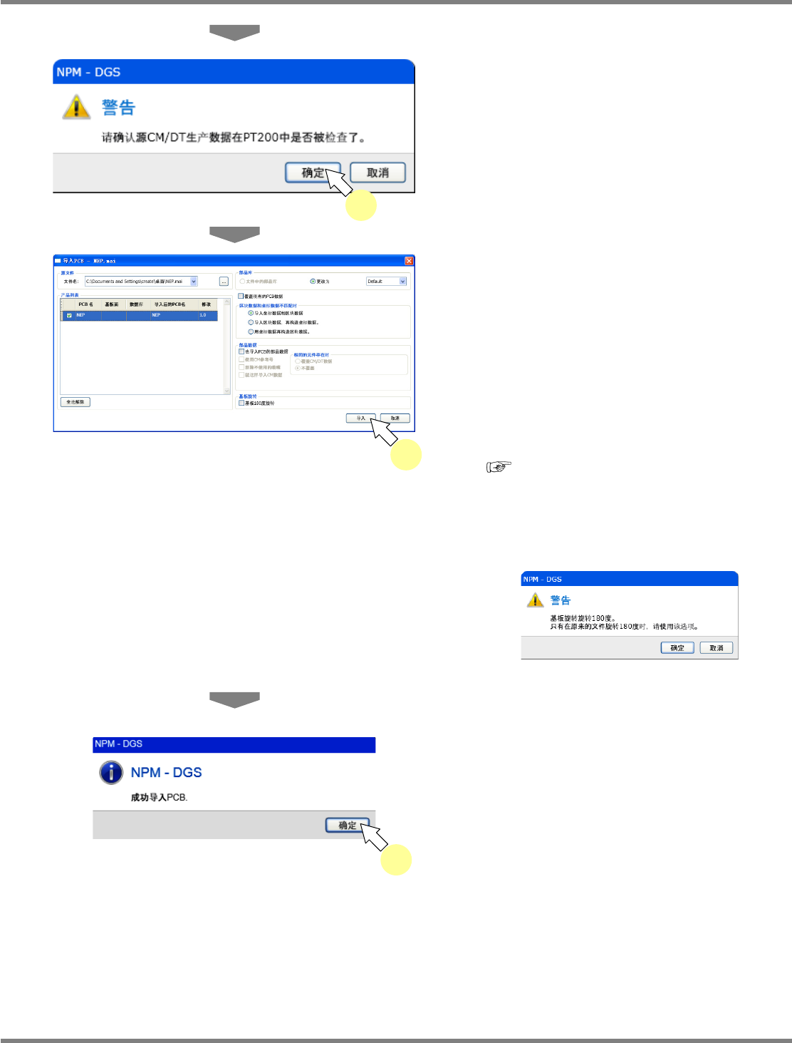 NPM-DGS 程序手册 5.6 生产数据的 PCB 导入 Page 5-100 EJS9AC-MB-05P-03 PCB 导入的设定项目 项目 说明 文件名 显示所选择文件的名称。 复选框 请选择执行导入的 PCB 。初期显示为选择了全部 PCB 的状态。 ‘PCB 名 ’ 显示要导入的 PCB 名称。 ‘ 基板面 ’ 显示导入的基板面。将显示 [ 表面 ] 、 [ 背面 ] 中的某一项。 ‘ 数据库 ’ 显示要导入的 PCB 名…