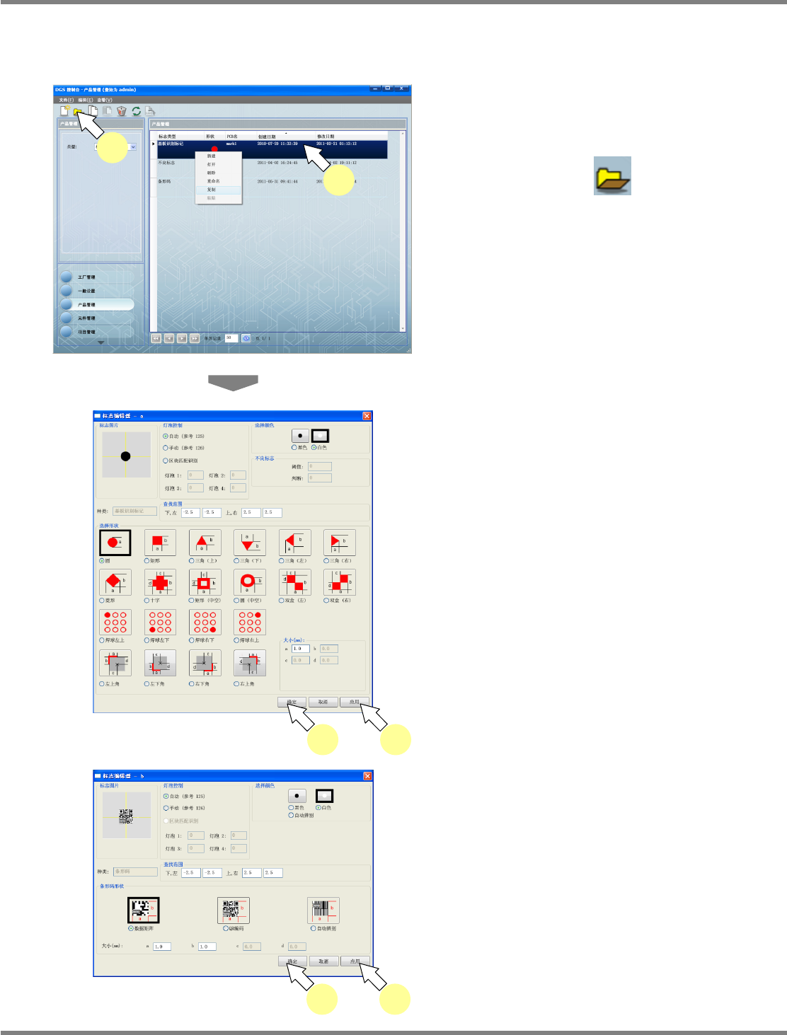 NPM-DGS 程序手册 5.7 标记的设定 EJS9AC-MB-05P-03 Page 5-113 5.7.3 标记的编辑 对已登录的标记、条形码进行编辑。 1 在 PCB 一览中选择要编辑的标记、条 形码。 2 选择工具栏的 ( 打开 ) , 或者菜单 栏的 [ 文件 ] [ 打开 ] ,或者在右击菜单 中选择 [ 打开 ] 。 显示出 < 标志编辑器 – 基准 > 画面。 3 对要编辑的地方进行必要的设定, 点…