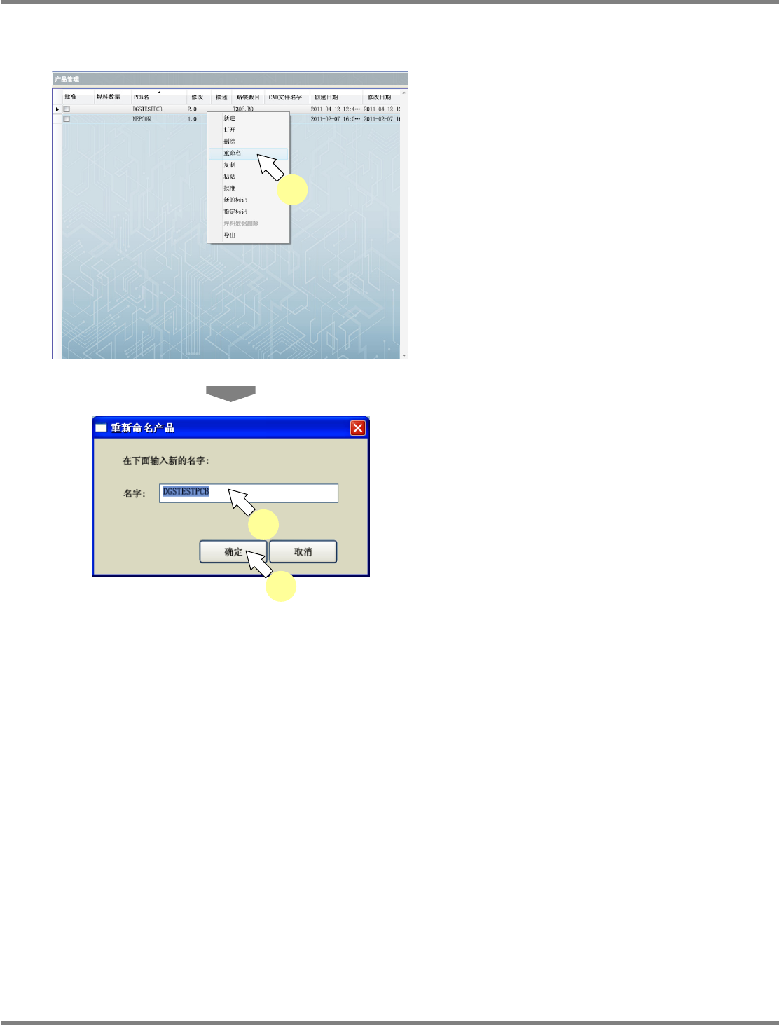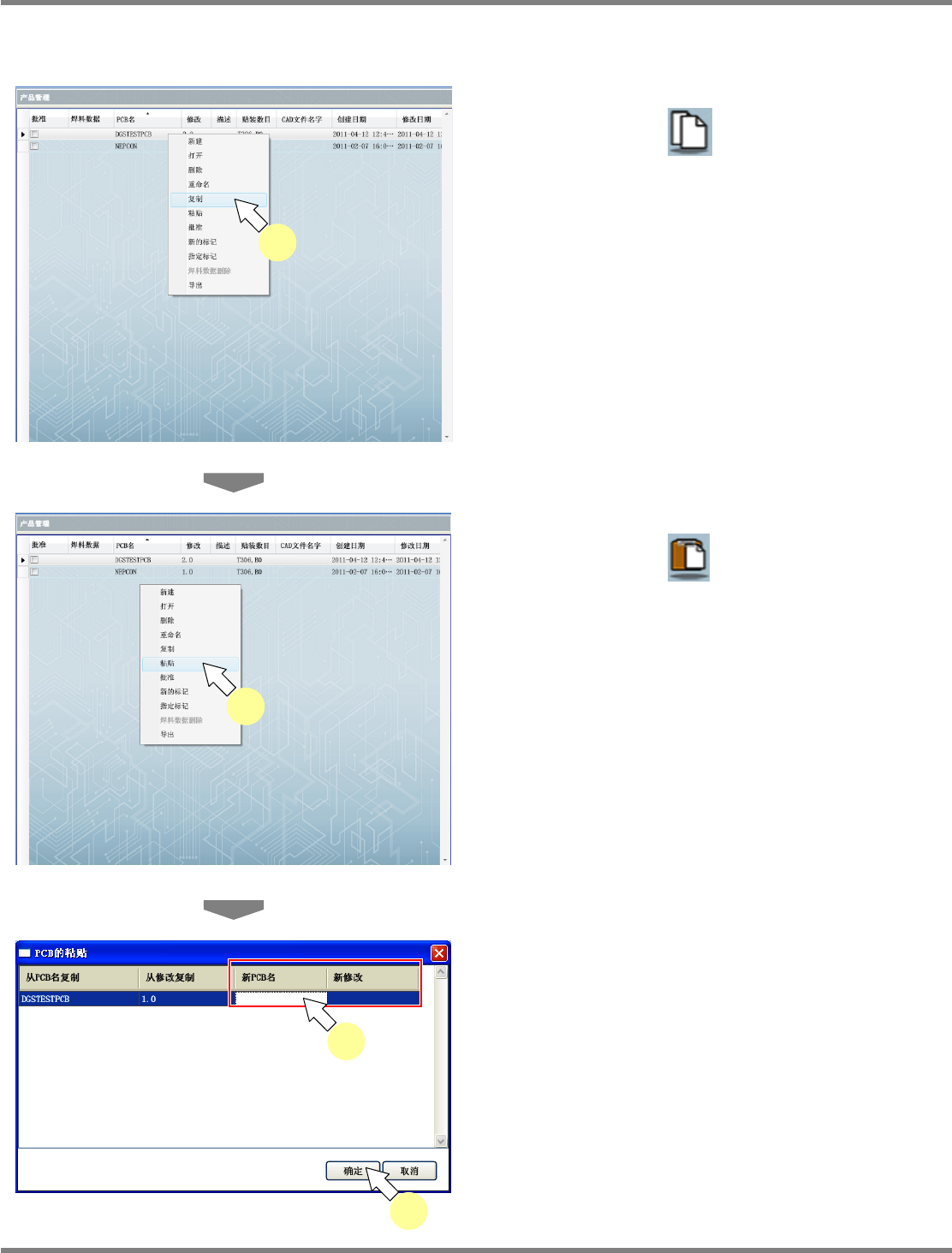 NPM-DGS 程序手册 5.8 PCB 编辑 Page 5-120 EJS9AC-MB-05P-03 现存 PCB 的复制 1 在 PCB 一览表中选择已登录的 PCB , 点击工具栏的 ( 复制 ) ,或者菜单 栏的 [ 编辑 ] [ 复制 ] ,或者在右击菜单 中选择 [ 复制 ] 。 2 在 PCB 一览表中选择已登录的 PCB , 点击工具栏的 ( 粘贴 ) ,或者菜单 栏的 [ 编辑 ] [ 粘贴 ] ,或者在右…