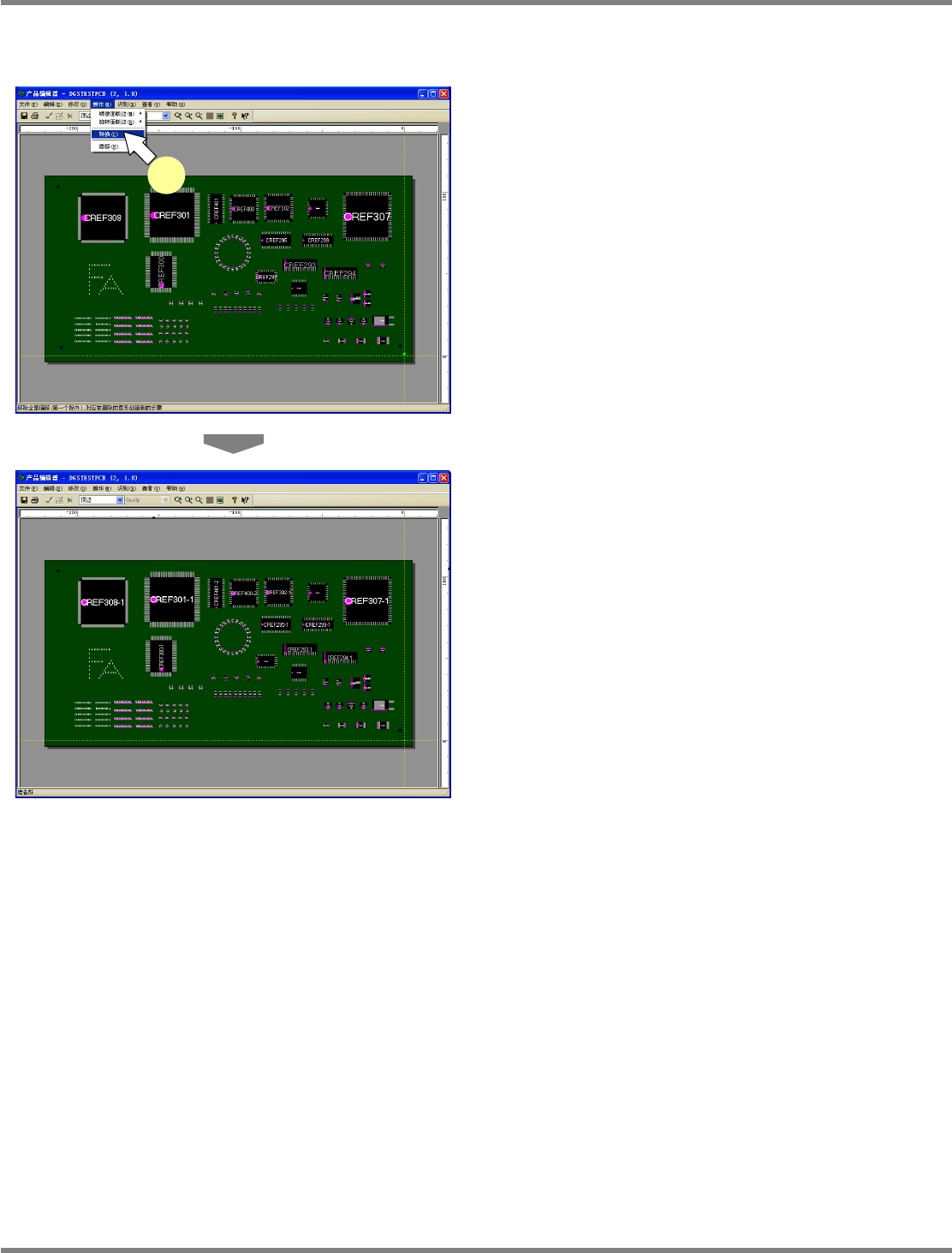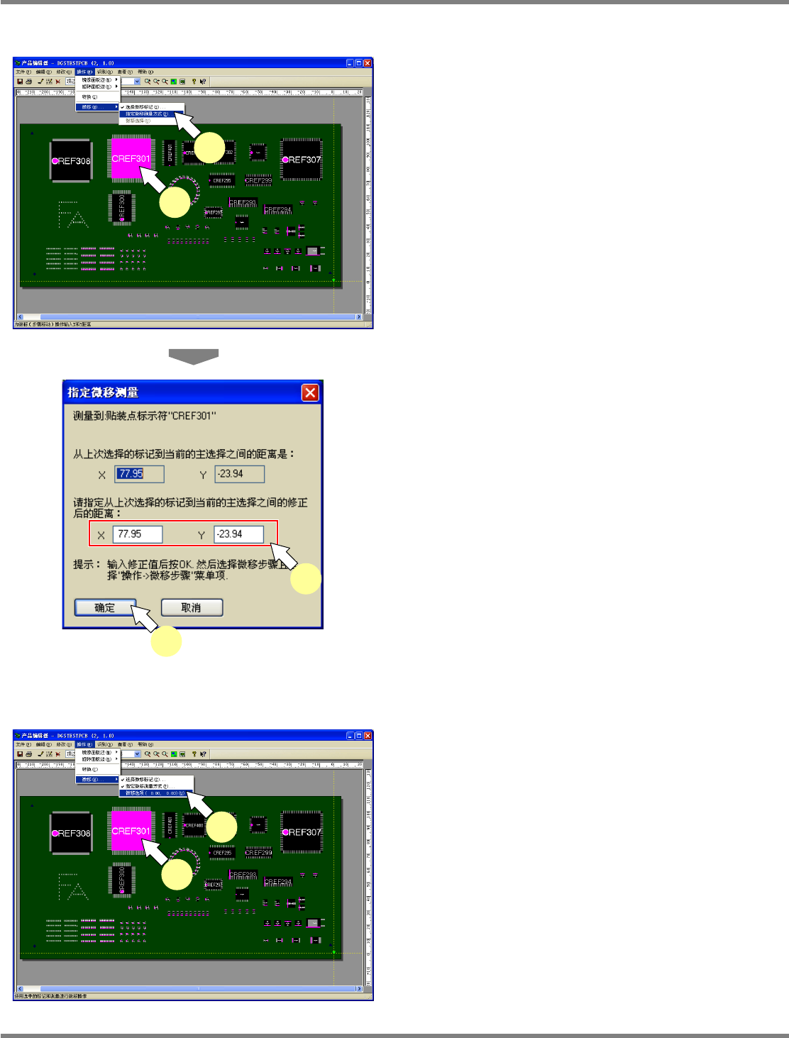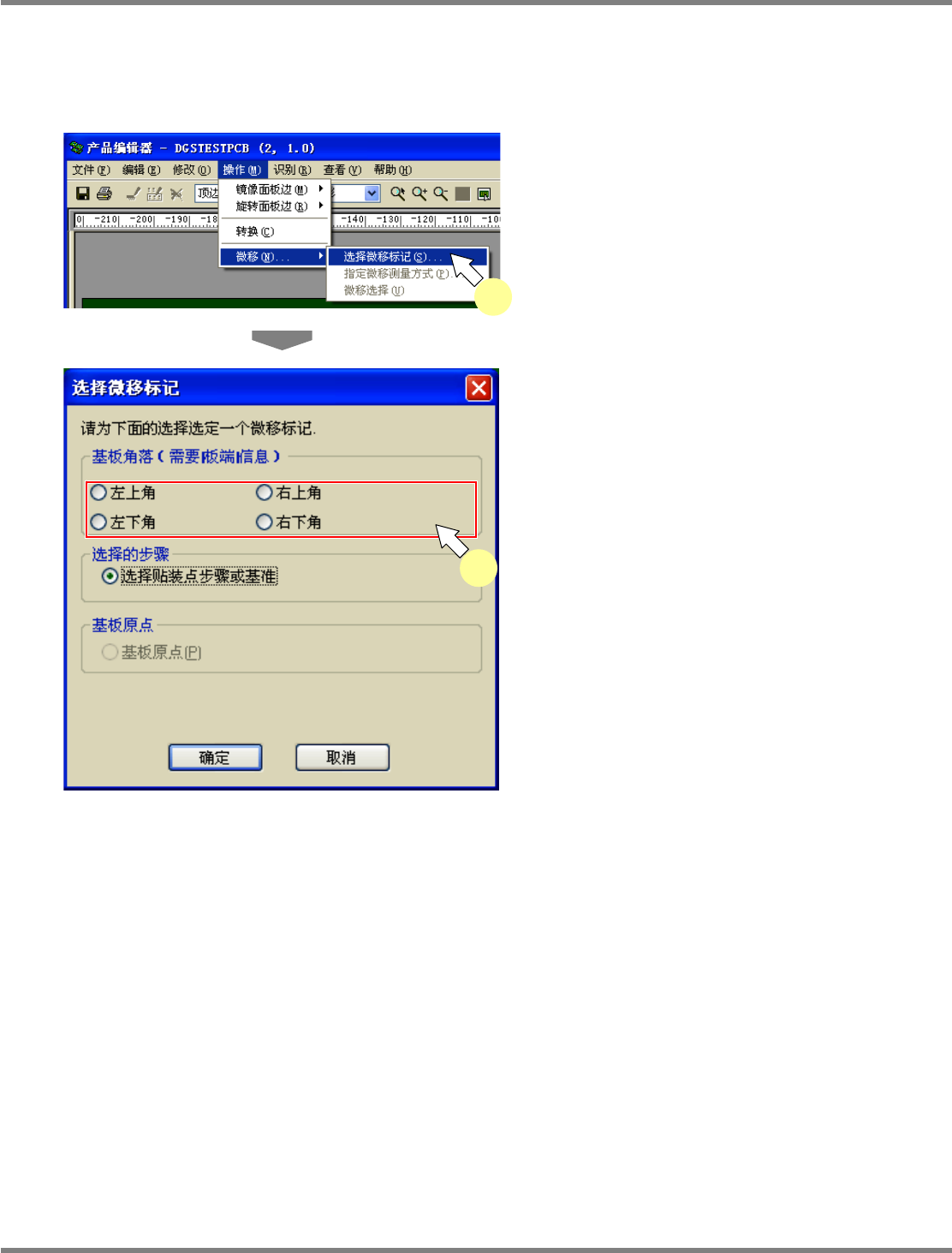 NPM-DGS 程序手册 5.8 PCB 编辑 EJS9AC-MB-05P-03 Page 5-143 位置的调整 ① 基准位置的选择 1 选择菜单栏的 [ 操作 ] [ 微移 ] [ 选择 微移标记 ] 。 显示出 < 选择微移标记 > 画面。 2 指定作为位置调整基准的位置。 在将 ‘ 选择的步骤 ’ 设为基准位置时,先在基板 上选择贴装点或标记后, 再执行 [ 操作 ] [ 微移 ] [ 选…