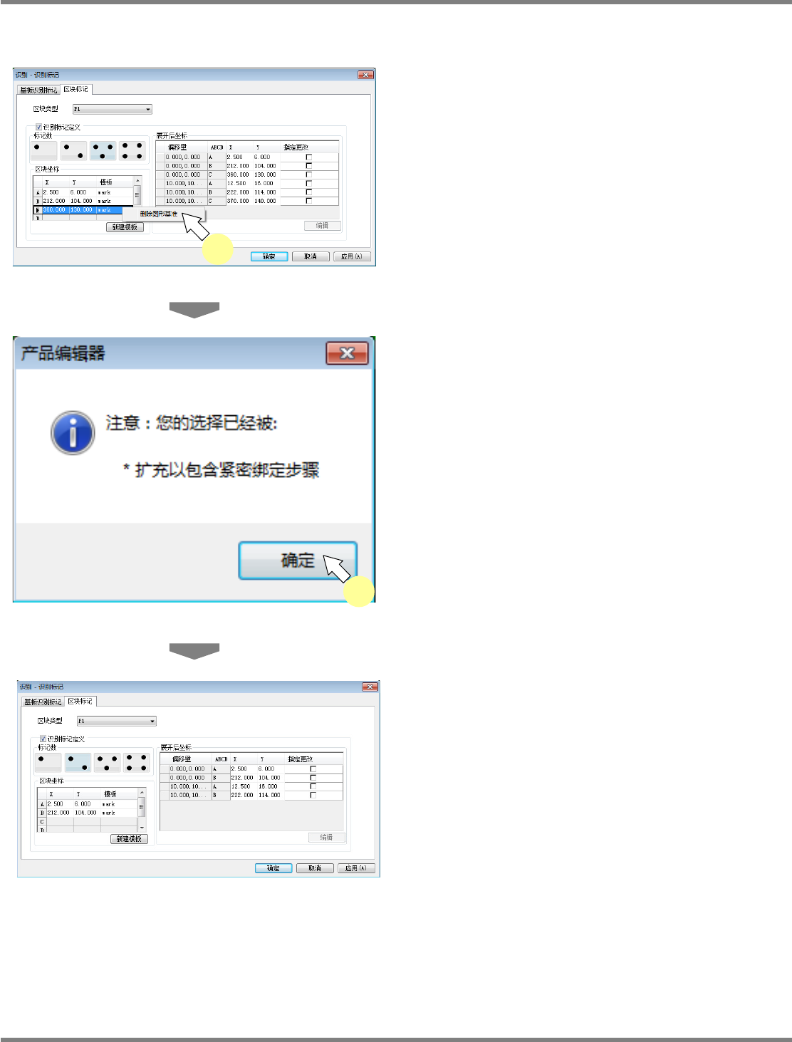 NPM-DGS 程序手册 5.8 PCB 编辑 EJS9AC-MB-05P-03 Page 5-161 ④ 在产品编辑器上选择删除图形基准 1 在产品编辑器上选择想要删除的图形 基准后, 点击右击菜单的 [ 删除所选中的 步骤 ] 。 2 将显示确认对话框,点击 [ 是 ] 。 将从产品编辑器上删除所选择的图形 基准。 Project050802S-1 38C00 1 Project050802S-1 36C00 2 PProjec…