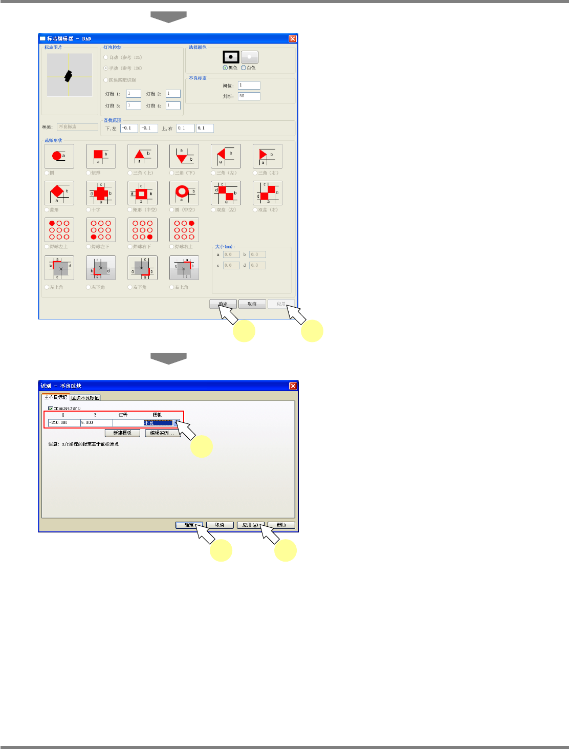 NPM-DGS 程序手册 5.8 PCB 编辑 Page 5-164 EJS9AC-MB-05P-03 ① 添加新建的代表不良标记 1 选择菜单栏的 [ 识别 ] [ 不良标记 ] 。 显示出 < 识别 – 不良区块 > 画面。 2 选择 [ 主不良标记 ] 标签。 3 在 ‘ 不良标记定义 ’ 栏中打勾。 4 在重新登录标记时,点击 [ 新建模板 ] 。 显示出 < 新建基准标志 > 画面。 如…