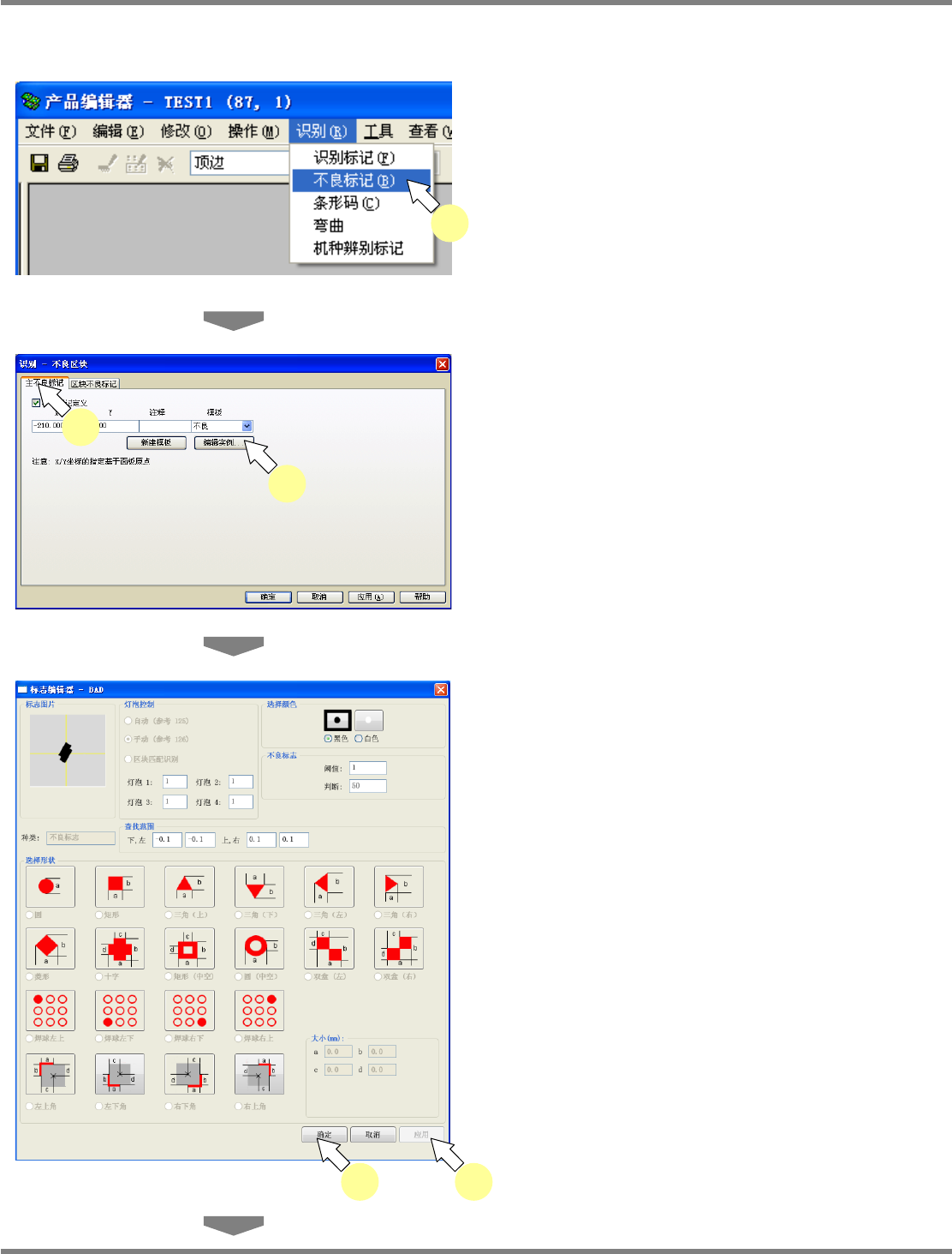 NPM-DGS 程序手册 5.8 PCB 编辑 EJS9AC-MB-05P-03 Page 5-165 6 对要编辑的地方进行必要的设定, 点击 [ 应用 ] 。 7 点击 [ 确定 ] 。 关闭 < 标志编辑器 > 画面。 8 进行代表不良标记的设定。 9 点击 [ 应用 ] 。 10 点击 [ 确定 ] 。 关闭 < 识别 – 不良区块 > 画面。 在 PCB 编辑器上显示出代表不良标记。 Pro…