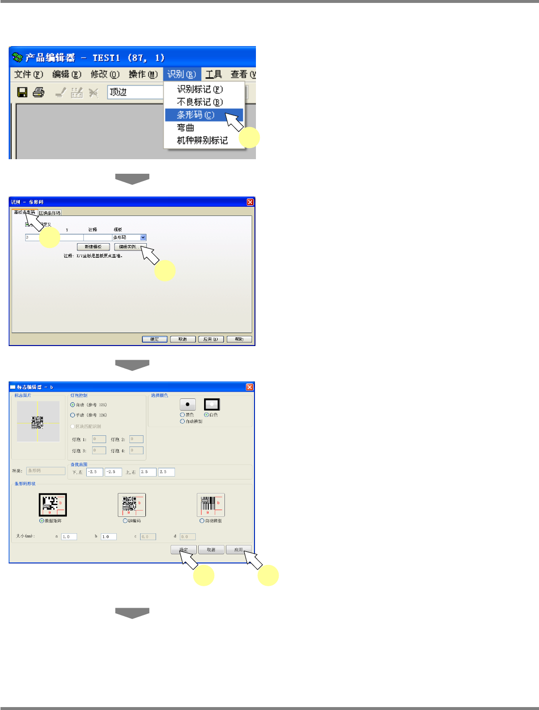 NPM-DGS 程序手册 5.8 PCB 编辑 Page 5-178 EJS9AC-MB-05P-03 ② 基板条形码的编辑 1 选择菜单栏的 [ 识别 ] [ 条形码 ] 。 显示出 < 识别 – 条形码 > 画面。 2 选择 [ 基板条形码 ] 标签。 3 进行标记编辑时,点击 [ 编辑实例 ] 。 显示出 < 标志编辑器 > 画面。 如果不进行标记变更,请跳过步骤 3. ,进行步 骤 6. …