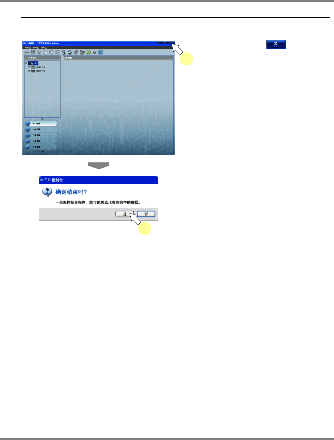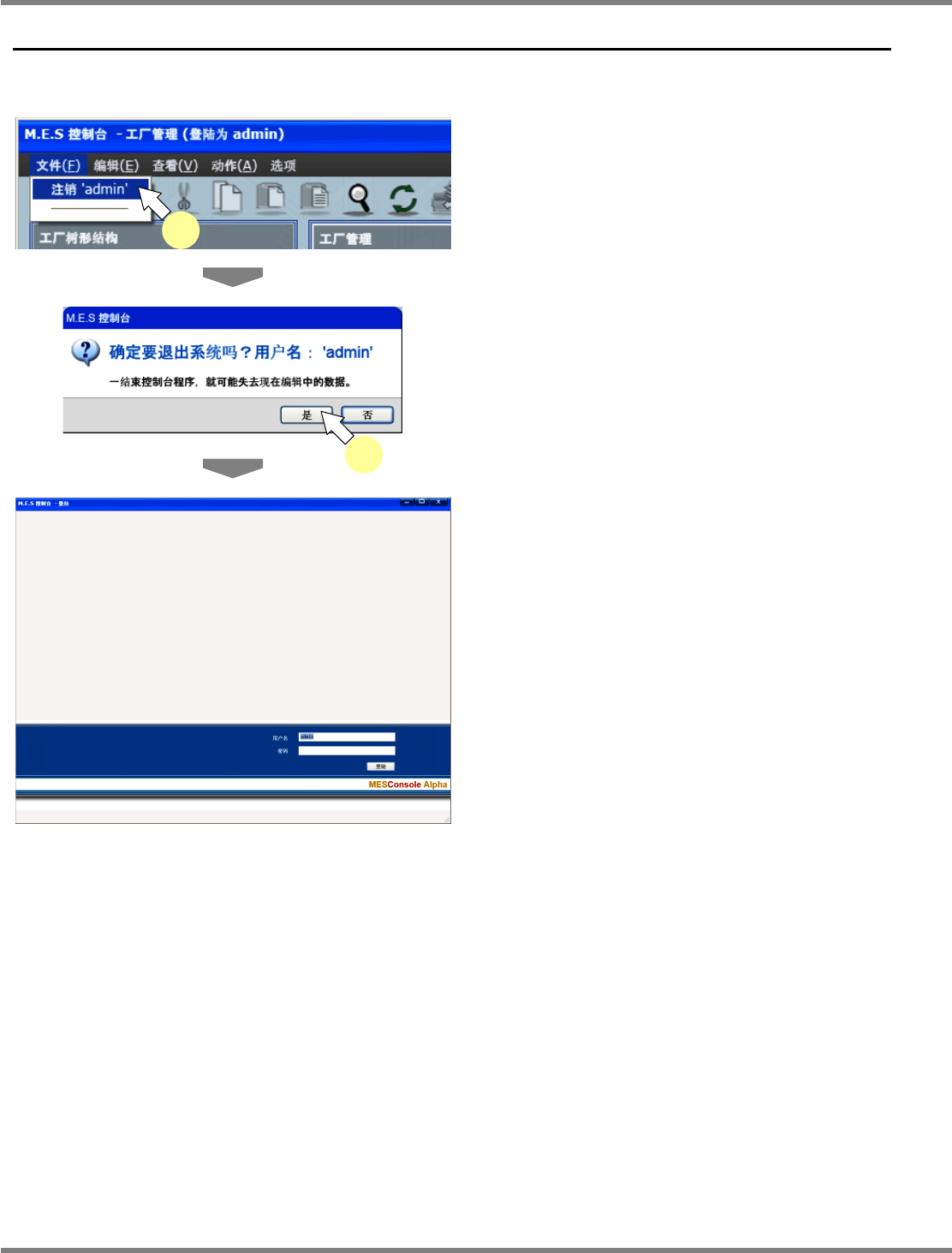 NPM-DGS 程序手册 1.4 NPM-DGS 的登出 Page 1-16 EJS9AC-MB-01P-02 1.4 NPM-DGS 的登出 登出 DGS 。 1 銷选择菜单栏的 [ 文件 ] [ 注销 ] 。 显示出确认画面。 2 点击 [ 是 ] 。 显示出登出画面。 Other010400S- 03C00 Other010400S- 01C00 1 Other010400S- 02C00 2