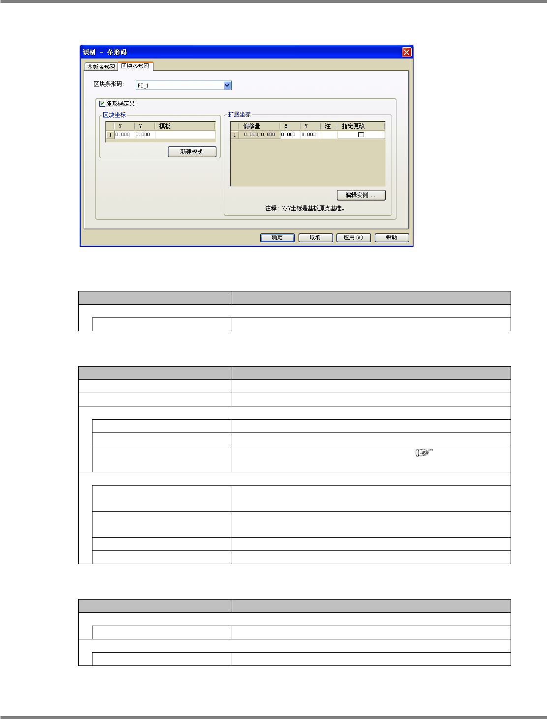 NPM-DGS 程序手册 5.8 PCB 编辑 Page 5-192 EJS9AC-MB-05P-03 图形条形码 显示项目 项目 说明 ‘ 扩展坐标 ’ ‘ 偏移量 ’ 显示图形条形码的 X 、 Y 坐标的偏移。 设定项目 项目 说明 ‘ 区块条形码 ’ 选择对哪一个图形类型进行设定。 ‘ 条形码定义 ’ 使用图形条形码时打勾。 ‘ 区块坐标 ’ ‘X’ 设定图形条形码基准的 X 坐标。 ‘Y’ 设定图形条形码基准的 Y …