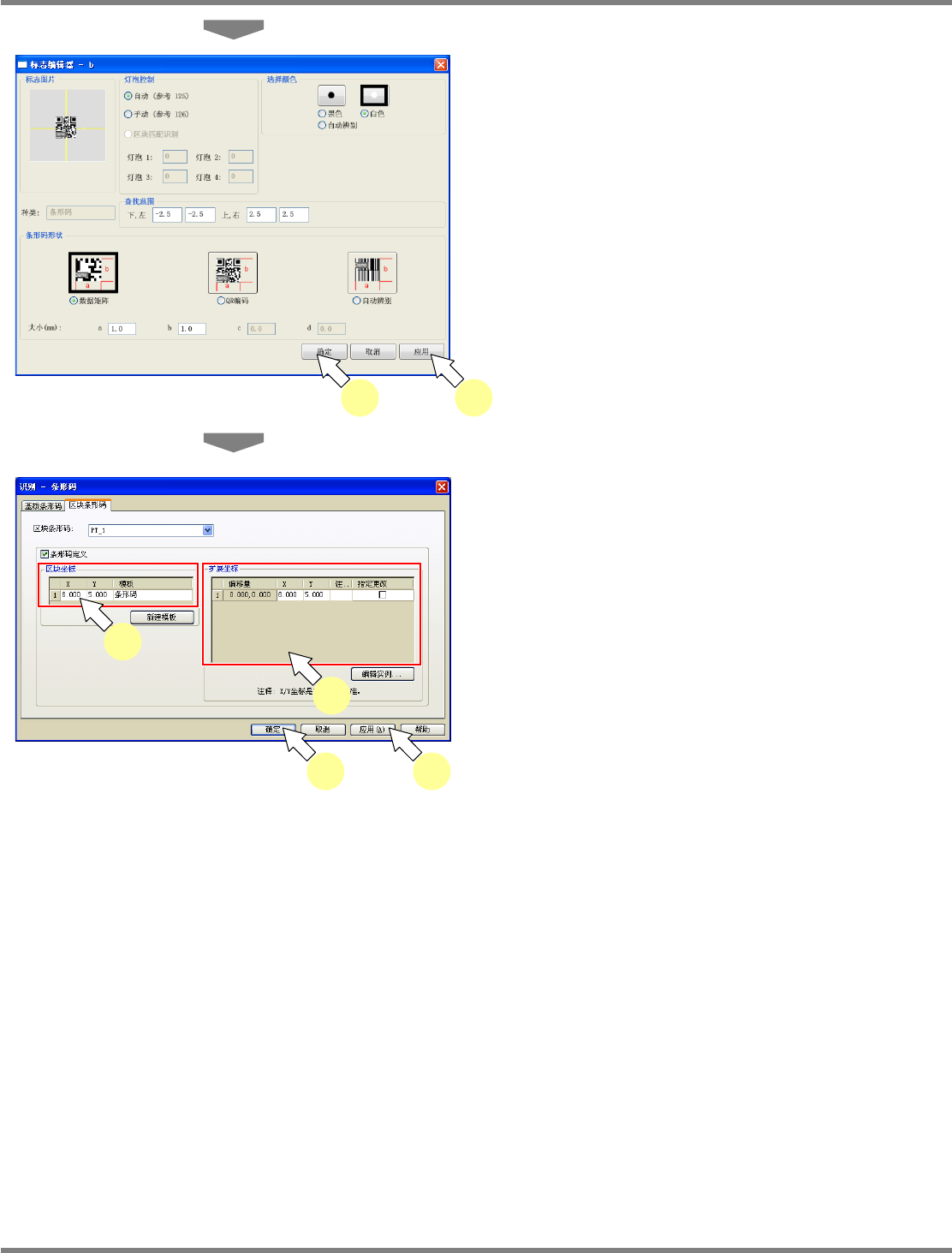 NPM-DGS 程序手册 5.8 PCB 编辑 EJS9AC-MB-05P-03 Page 5-193 ① 添加新建的图形条形码 1 选择菜单栏的 [ 识别 ] [ 条形码 ] 。 显示出 < 识别 – 条形码 > 画面。 2 选择 [ 区块条形码 ] 标签。 3 选择要添加图形条形码的图形类型。 4 在 ‘ 条形码定义 ’ 栏中打勾。 5 在重新登录标记时,点击 [ 新建模板 ] 。 显示出 < 新建基准…
